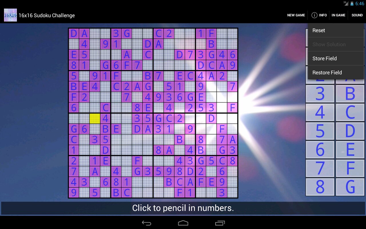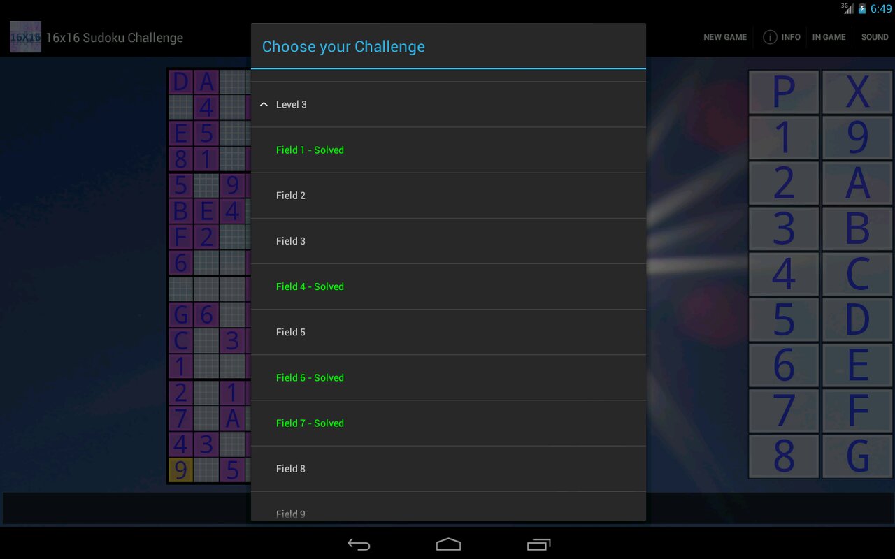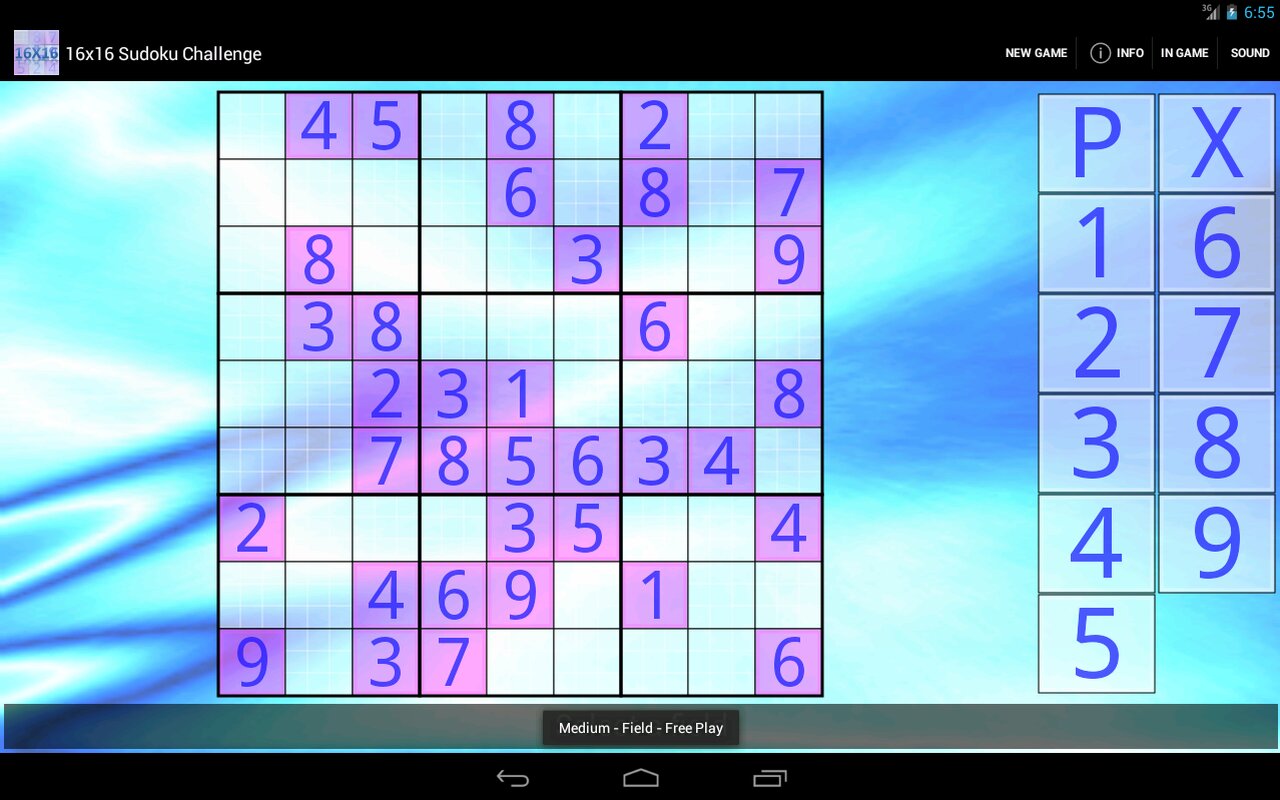 16x16 Sudoku Challenge — усложненный вариант классической логической игры для Android. Здесь игра ведется на поле размером 16х16 клеток, где нужно вписывать числа от 1 до 9 и буквы от A до G (которые соответствуют числам 10-16) таким образом, чтобы в каждой строке и каждом столбце цифры и буквы встречались только по одному разу. Клетки также образуют ячейки размером 4х4, в которых каждая цифра и буква не должна повторяться.