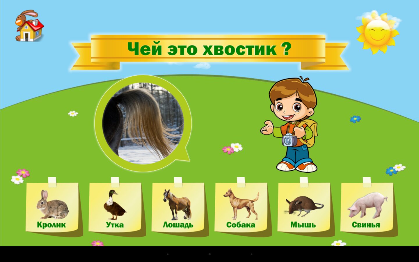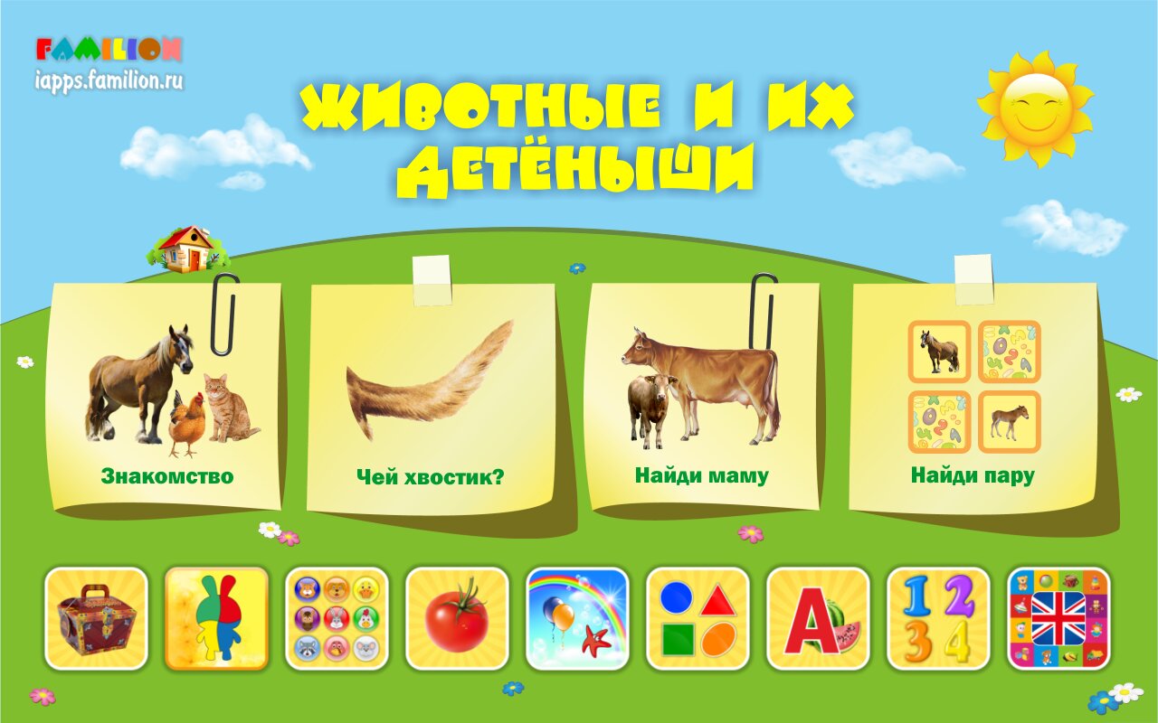 Эта программа — детское обучающее приложение об основных домашних животных, которые должен будет изучить Ваш малыш, и их детёнышах. С его помощью в игровой форме он сможет изучить, как называются детёныши тех или иных животных, как выглядит хвостики различных животных, а игровые тестовые режимы позволят ему закрепить полученные знания. Красочная картинки животных и веселая музыка еще больше дополнят процесс обучения.