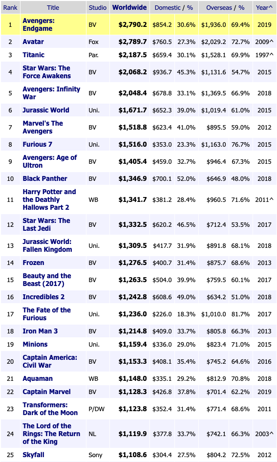 Фильм «Мстители: Финал» (Avengers: Endgame) 2019 года официально поставил новый кассовый рекорд. По состоянию на 22 июля глобальные сборы супергеройского блокбастера от студии Marvel Studios составили 2,7902 млрд долларов, превзойдя показатель фантастической картины Джеймса Кэмерона «Аватар» (Avatar) 2009 года, которая собрала в общей кассе 2,7897 млрд долларов и возглавляла рейтинг невероятные 10 лет подряд. Таким образом, четвёртая и финальная часть франшизы про величайших героев Земли заняла почётное звание самого успешного фильма в истории.