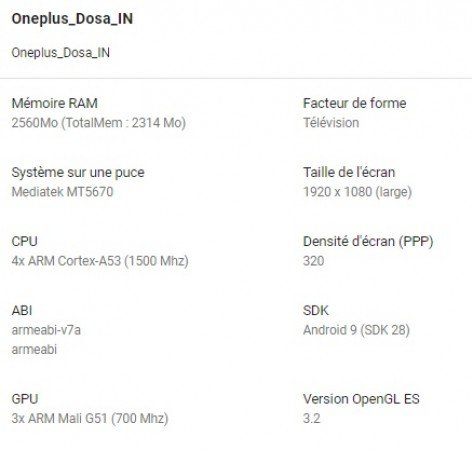 OnePlus TV под кодовым названием «Dosa» получит пока ещё не представленную официально аппаратную платформу MediaTek MT5670. Этот чипсет имеет в своём распоряжении четыре ядра Cortex-A53 с частотой до 1,5 ГГц и графический ускоритель Mali-G51 с частотой 700 МГц. Устройство также будет оснащаться 3 ГБ оперативной памяти, а в качестве программного обеспечения выступит операционная система Android 9 Pie. На скриншоте можно увидеть разрешение 1920×1080 пикселей, но это, скорее всего, относится к интерфейсу и оболочке в целом, тогда как при воспроизведении контента телевизор будет переключаться в 4K.