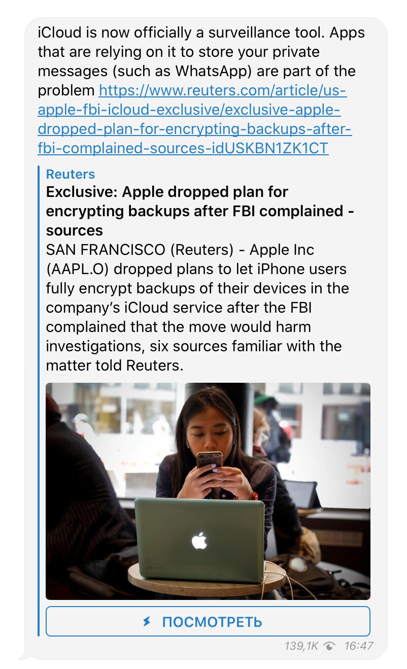 В своей заметке журналисты Reuters отмечают, что Apple решила не использовать оконечное шифрование в разрезе резервных копий. Это говорит о том, что у компании останется специальный ключ для возможного доступа к ним на серверах iCloud. Издание подчеркивает, что это подтвердил целый ряд бывших и нынешних работников Apple, а также сотрудники ФБР.