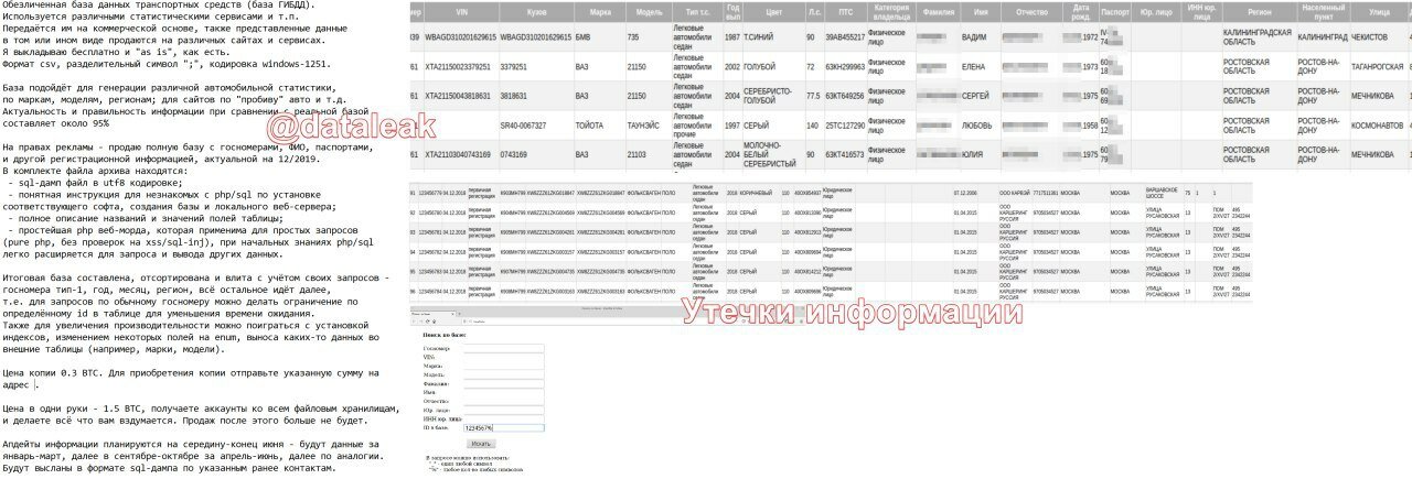 На просторах даркнета неизвестные опубликовали базу данных автовладельцев из России, состоящую из 23 файлов формата CSV общим объёмом в 24 ГБ. Общедоступная утечка содержит только обезличенные данные, в числе которых марка и модель автомобиля, дата с местом регистрации транспортного средства и тому подобные. Однако продавцы заявляют, что у них есть и полная версия базы данных с ФИО, номером паспорта, адресом, датой рождений и контактными данными жертв. Её продают отдельно. Информация об этом появилась в Telegram-канале «Утечки информации», которым, по данным «Ведомостей», управляет Ашот Оганесян, создатель DeviceLock (программного комплекса для защиты организаций от утечек информации).