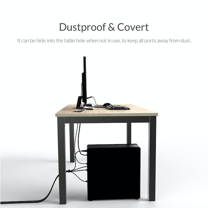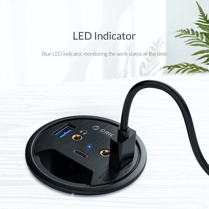 Во многих письменных столах есть специальное отверстие, предназначенное для просовывания кабелей через него — чтобы они не валялись по всему столу, а аккуратно размещались в одном месте. Но на деле даже такая реализация не совсем удобна: провода всё так же хаотично скручиваются и валяются, только тянутся из одного отверстия. Навести порядок поможет хаб от известной компании Orico, который вставляется в это отверстие. Он оснащён двумя портом USB-A 3.0, одним разъёмом USB-C 3.0 и двумя аудиопортами (для наушников и микрофона).
