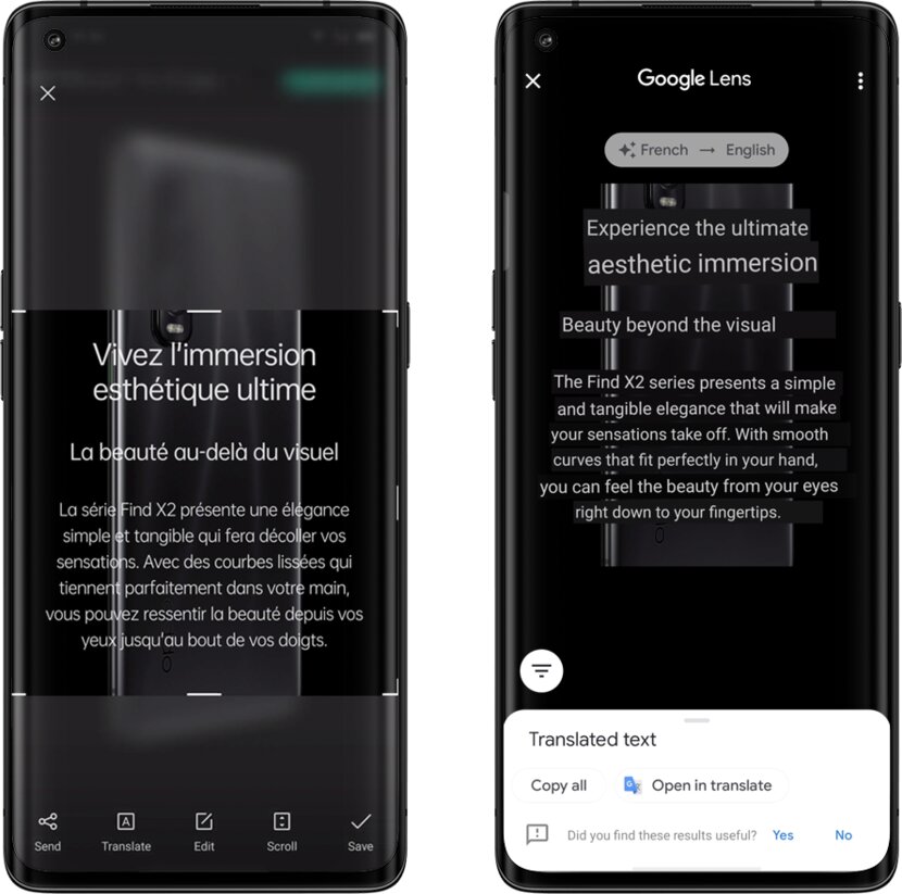 Жест смахивания тремя пальцами по экрану делает скриншот и активирует функцию перевода текста на экране с помощью «Google Переводчика» — пользователю необходимо лишь указать нужный участок путём кадрирования. Данная опция работает на базе Google Lens и подменяет оригинальный текст переведённым — для удобства использования всегда можно открыть переведённый текст в «Google Переводчике», соответствующая кнопка есть в меню редактирования скриншота.