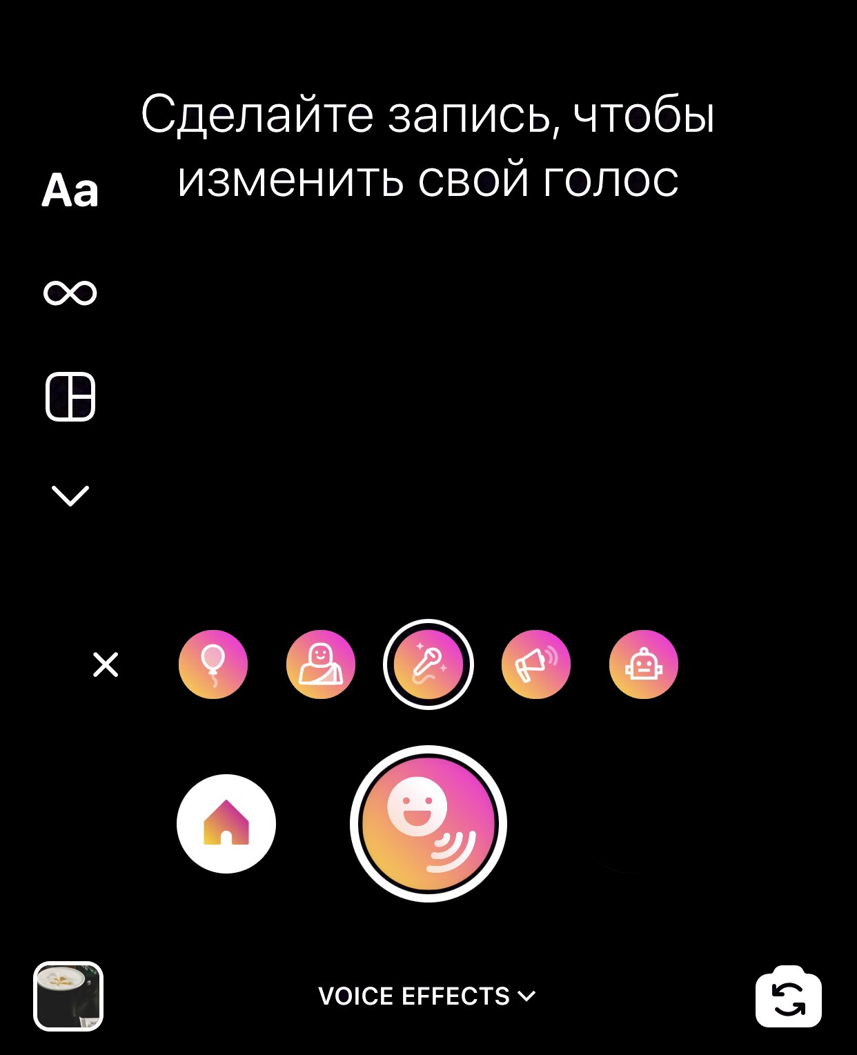 Нововведение работает нативным образом, голос изменяется прямо в режиме записи во встроенном видоискателе Instagram*. В настоящее время пользователям доступно пять эффектов: