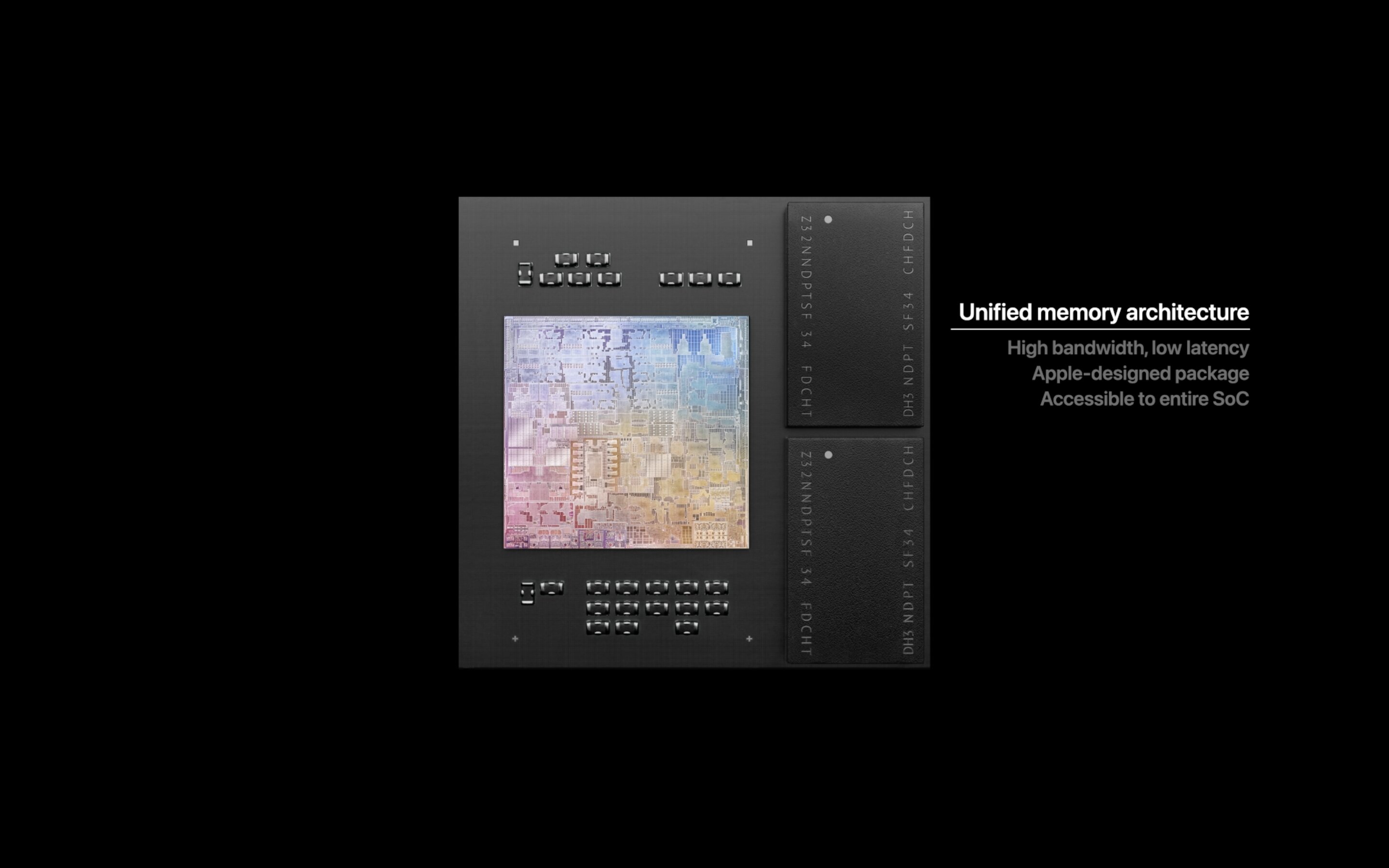 - Apple M1 имеет объединённую память с высокой пропускной способностью и низкой задержкой, что позволяет всем технологиям чипа получать доступ к одним и тем же данным без копирования их между несколькими пулами памяти.