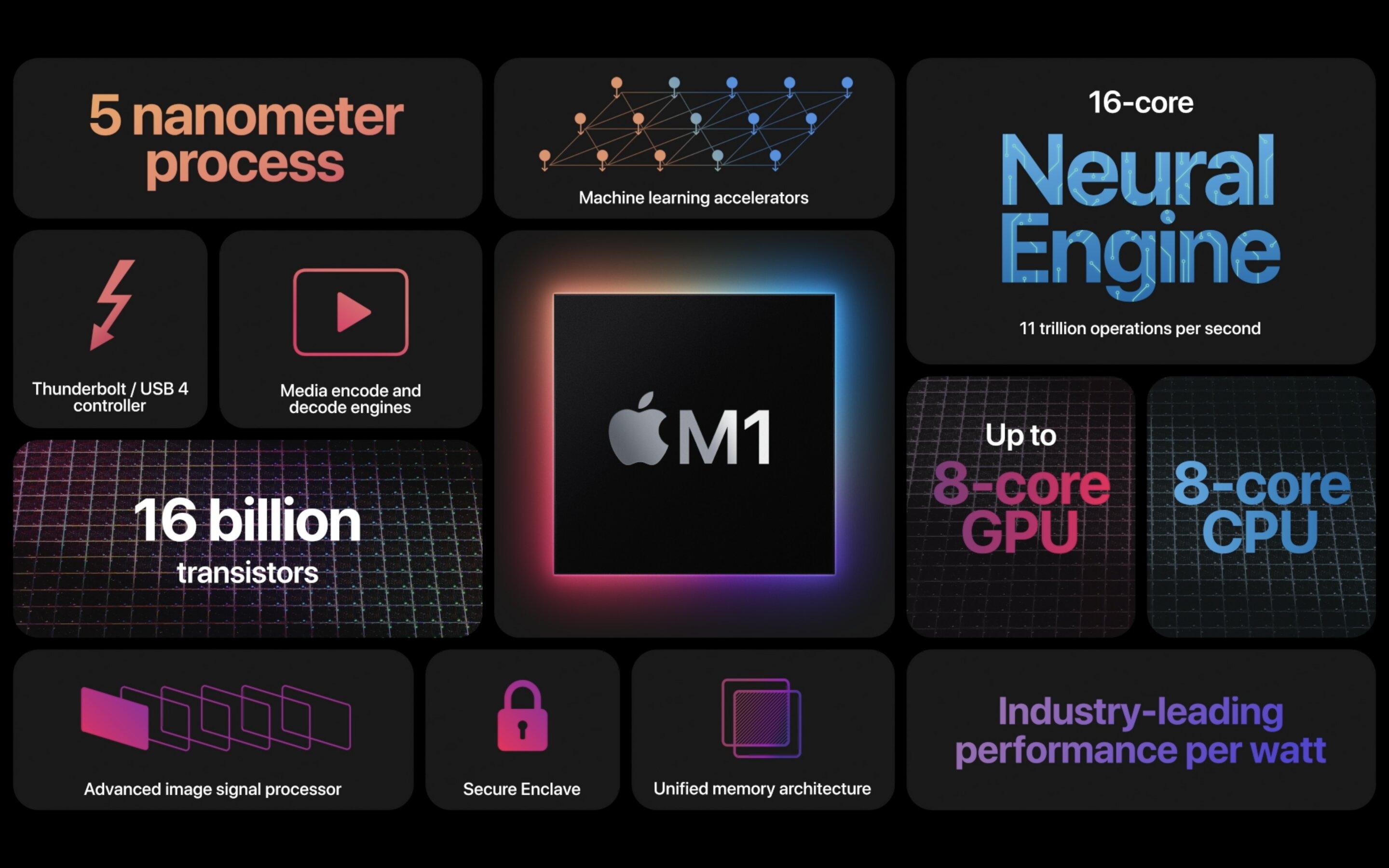 Apple M1 представляет собой передовую аппаратную платформу с уникальной унифицированной архитектурой компонентов, разработанной Apple. В состав процессора вошли восемь вычислительных ядер (четыре высокопроизводительных и четыре энергоэффективных), восемь графических ядер, чип безопасности Apple T2, память DDR4 и контроллер ввода-вывода Thunderbolt. Встроенная нейронная система Neural Engine для эффективной работы технологий искусственного интеллекта задействует 16 собственных ядер.