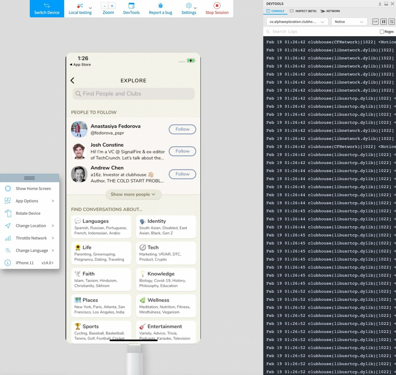 Чтобы зарегистрироваться в приложении, понадобится сервис автоматизированного тестирования мобильных устройств, например, BrowserStack, где есть возможность получить доступ к реальному iPhone. Автор говорит, что дополнительных настроек не требуется, нужно просто установить приложение Clubhouse из App Store. После запуска оно запросит номер телефона, на который отправит проверочный код. Для регистрации также понадобится приглашение, о чём следует подумать заранее.