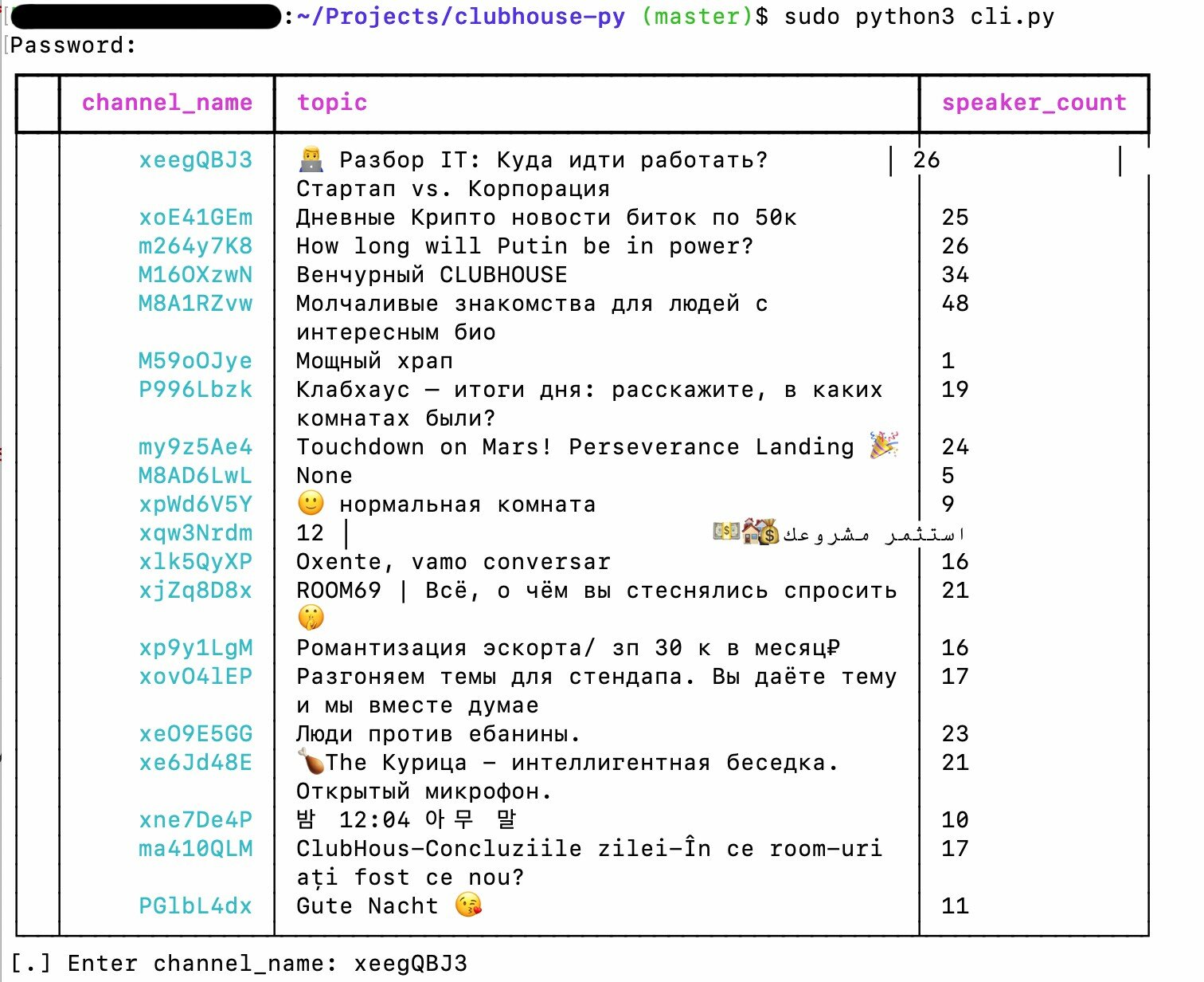К сожалению, все сервисы по тестированию мобильных телефонов не умеют перенаправлять звук и микрофон в браузер, поэтому для общения в комнатах придётся запустить на компьютере Python-приложение Сlubhouse-py, которое работает на Windows и macOS. Взять его можно на GitHub. У этого приложения есть много нюансов. Самый главный заключается в том, что оно консольное и у него соответствующий интерфейс, а значит нельзя видеть обновления списка спикеров и включать / выключать микрофон из приложения.