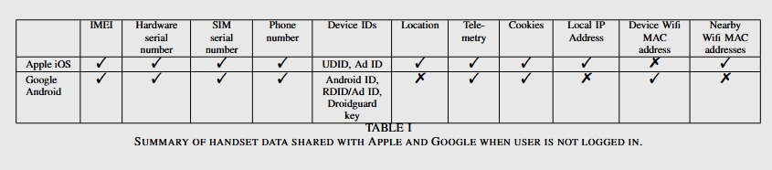 Дуглас Лейт подчёркивает, что сбор данных о владельцах смартфонов со стороны Apple и Google создаёт две основные проблемы. Во-первых, телеметрию можно использовать для привязки физических устройств к личным данным пользователя — вероятнее всего, эту информацию разработчики используют в рекламных целях.