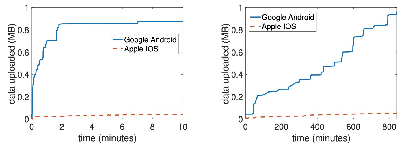 Профессор Дуглас Лейт (Douglas J. Leith) из Тринити-колледжа Дублинского университета проанализировал трафик, отправляемый смартфонами под управлением iOS и Android на серверы Apple и Google соответственно на различных этапах работы. В рамках этого исследования выяснилось, что Google собирает в 20 раз больший объём данных телеметрии c Android-устройств, чем Apple с iPhone.