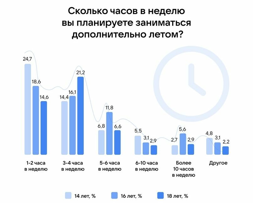 Если говорить о дополнительных занятиях по школьной программе в летний период, то пятая часть респондентов планирует посвящать учёбе 1-2 часа в неделю. 18% опрошенных выделят для этих целей 3-4 часа в неделю и только 7% школьников заявили, что собираются заниматься по 5-6 часов в неделю. Большая часть школьников, настроенных на учёбу, это девушки.