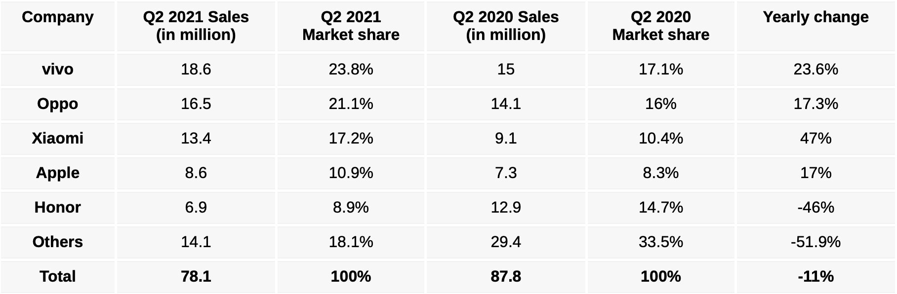 В целом топ-5 стал выглядеть следующим образом: Vivo — доля рынка 23,8%, продажи показали рост на 23,6% и составили 18,6 млн единиц смартфонов, OPPO — 21,1% (16,5 млн), Xiaomi — 17,2% (13,4 млн), Apple — 10,9% (8,6 млн), HONOR — 8,9% (6,9 млн). Поставки смартфонов в Китае за второй квартал 2021 года уменьшились на 11%. Общий объём поставок за первую половину 2021 года составил 164 млн, что на 6,5% больше по сравнению с предыдущим годом.