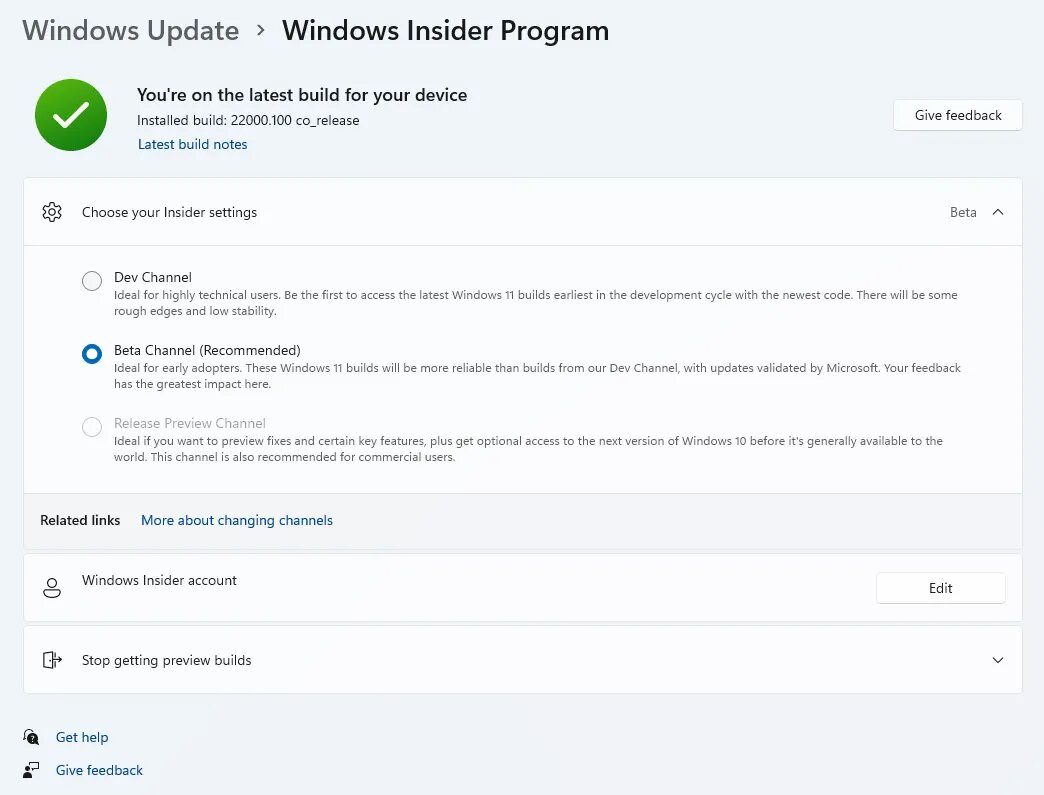 В настоящее время переключиться на бета-канал очень просто: нужно выбрать его в параметрах раздела «Программа предварительной оценки» в «Центре обновления Windows» и просто перезагрузить устройство. Рекомендуется поторопиться — возможность будет ограничена, так как обычно переход с Dev-канала на бета-канал осуществляется с полной переустановкой ОС. Об основных нововведениях в Windows 11 версии 22000.100 рассказано в отдельном материале.