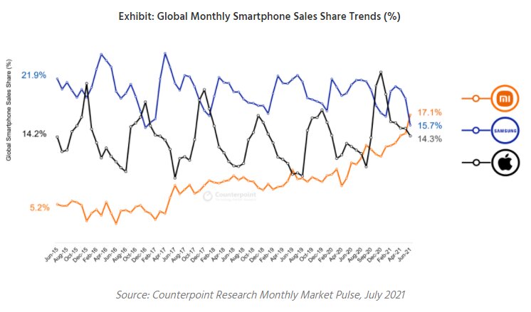 По данным аналитиков Counterpoint Research, в июне 2021 года Xiaomi стала ведущим производителем смартфонов в мире. Продажи смартфонов китайского производителя за месяц выросли на 26%, что сделало его самым быстрорастущим брендом на мировом рынке. Правда, если рассматривать весь второй квартал, то есть период с апреля по июнь, то Xiaomi заняла второе место на рынке, а пальма первенства вновь досталась Samsung.