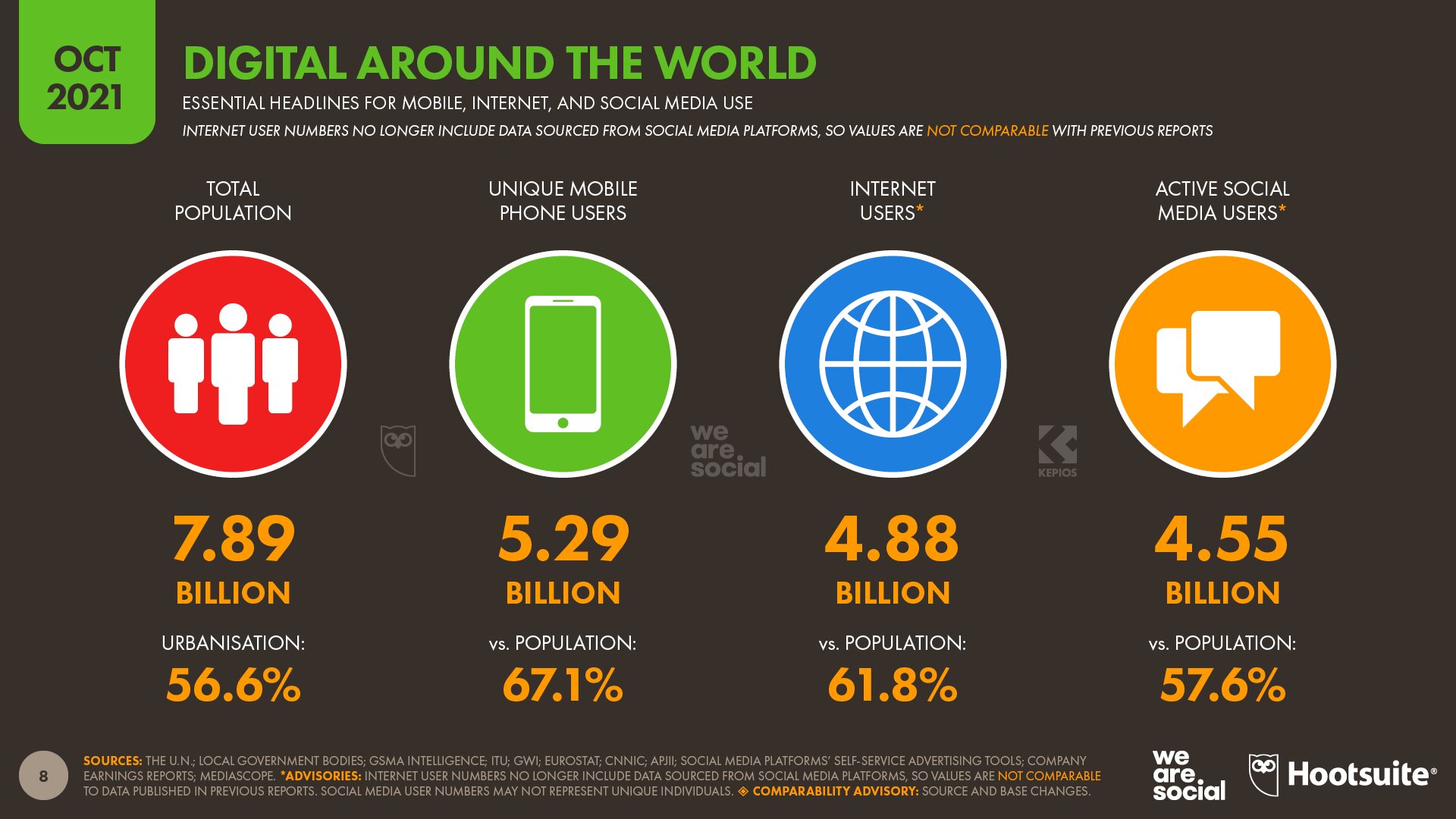 Аналитическое агентство DataReportal опубликовало свежую статистику об интернете и социальных сетях (за октябрь 2021 года), согласно которой лишь у 4,88 млрд людей есть интернет — это 61,8% от всего населения Земля (7,89 млрд). Активных пользователей социальных сетей меньше, но ненамного — 4,55 млрд или 57,6%.
