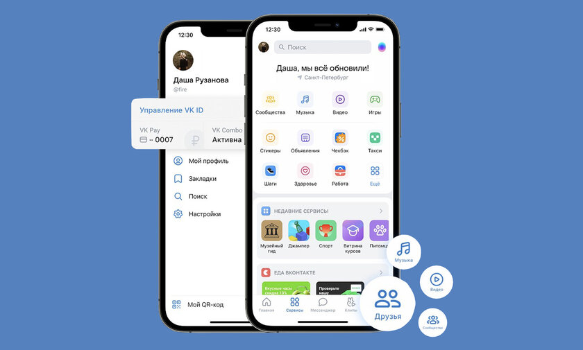 Боковое меню, содержащее настройки, быстрый переход к профилю и закладкам, аккаунт VK ID и прочее, будет открываться из любого раздела — для этого достаточно будет нажать на иконку своей аватарки в левом верхнем углу. Также на ней появится быстрый переход к глобальному поиску по «ВКонтакте», затрагивающему сообщества, музыку, записи, людей, видео, объявления и прочее.