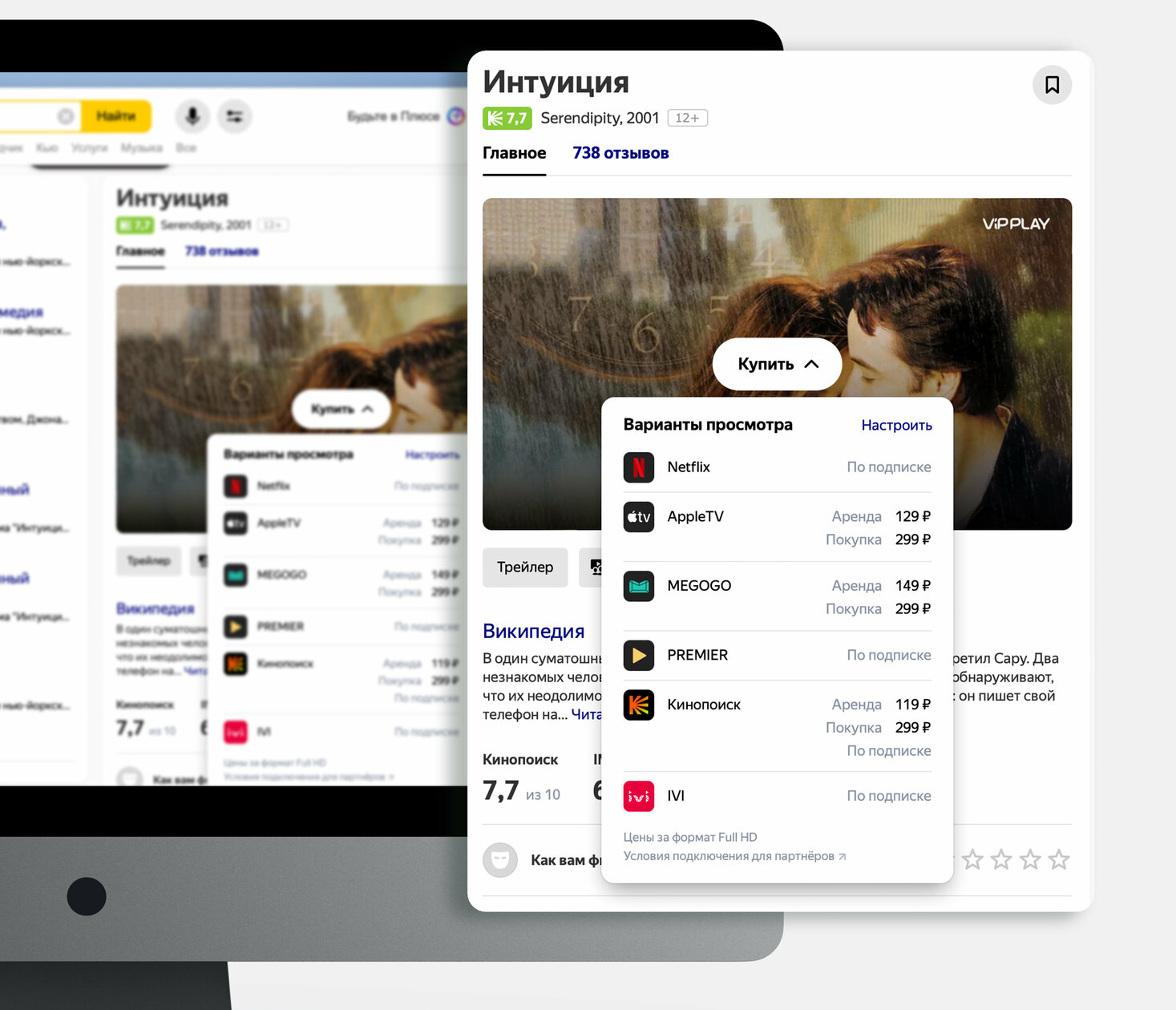 Наряду с обложкой, трейлером и рейтингами в карточке фильма появилось также краткое описание сюжета и список онлайн-кинотеатров, в которых этот фильм можно в данный момент посмотреть. Компания добавила в поиск платформы IVI, Оkko, more.tv, Кинопоиск, Netflix, Apple TV, Start, MEGOGO, Premier и KION. Если пользователь укажет, на какие сервисы он подписан, то Яндекс будет предлагать контент с них в первую очередь.