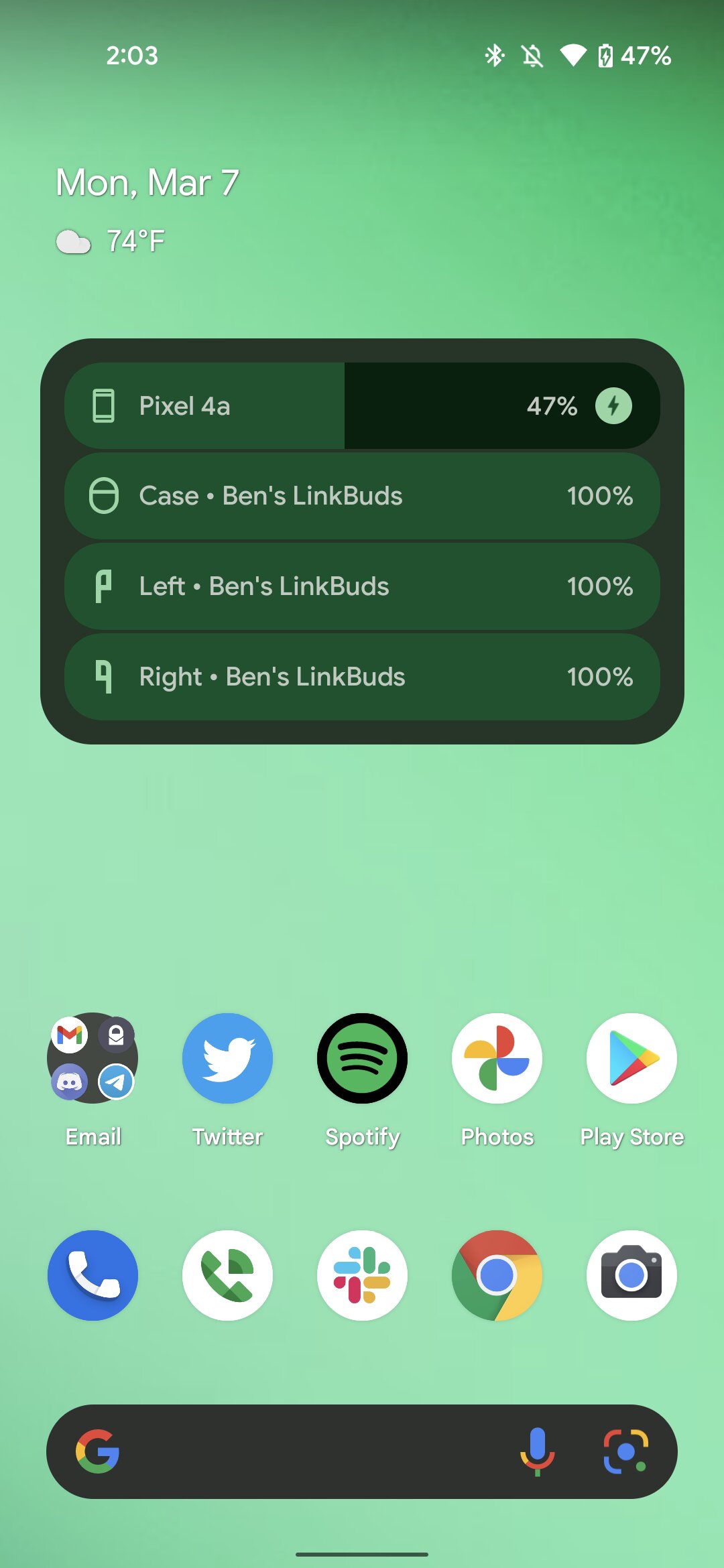 - Виджет Bluetooth-гарнитуры — недавно смартфоны Pixel получили этот удобный виджет, отображающий заряд сопряжённых беспроводных наушников. Правда, он работает корректно не со всеми наушниками.