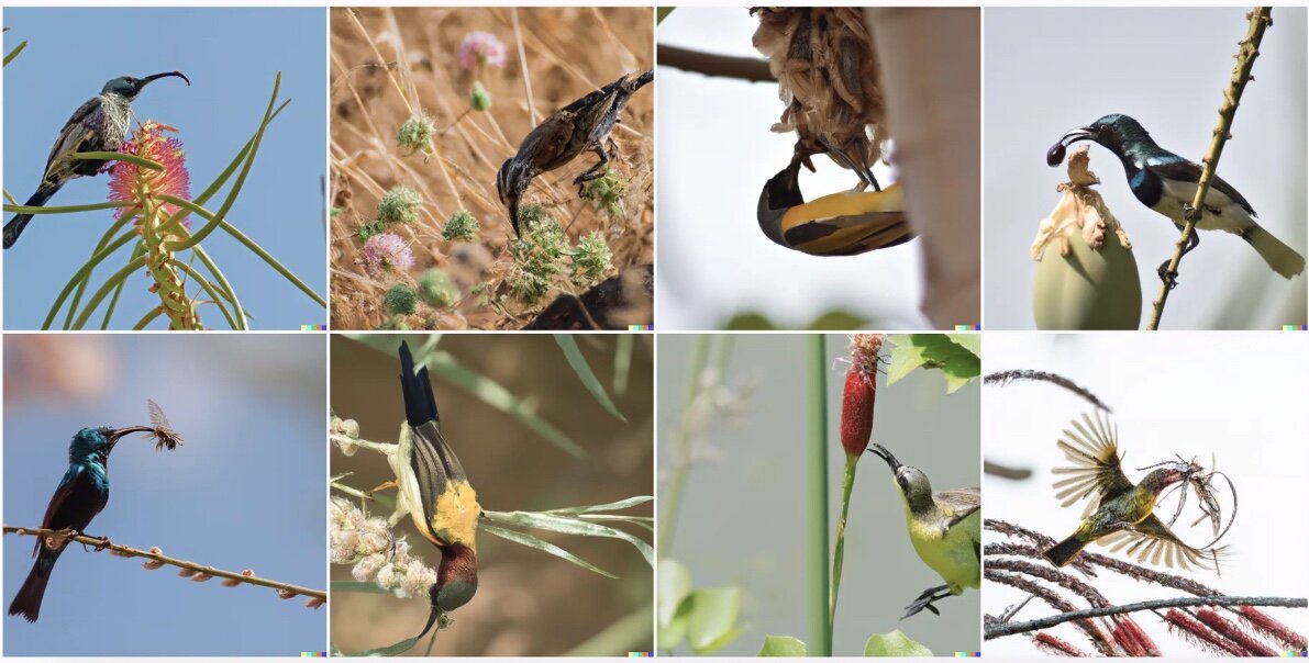 Более того, DALL-E 2 понимает скомбинированные запросы из английского и придуманного ею языка. К примеру, исследователи выяснили, что «Apoploe vesrreaitais» — это птицы, а «Contarra ccetnxniams luryca tanniounons» — это насекомые. По запросу «Apoploe vesrreaitais eating Contarra ccetnxniams luryca tanniounons» нейросеть создала картинки птиц, которые едят насекомых.