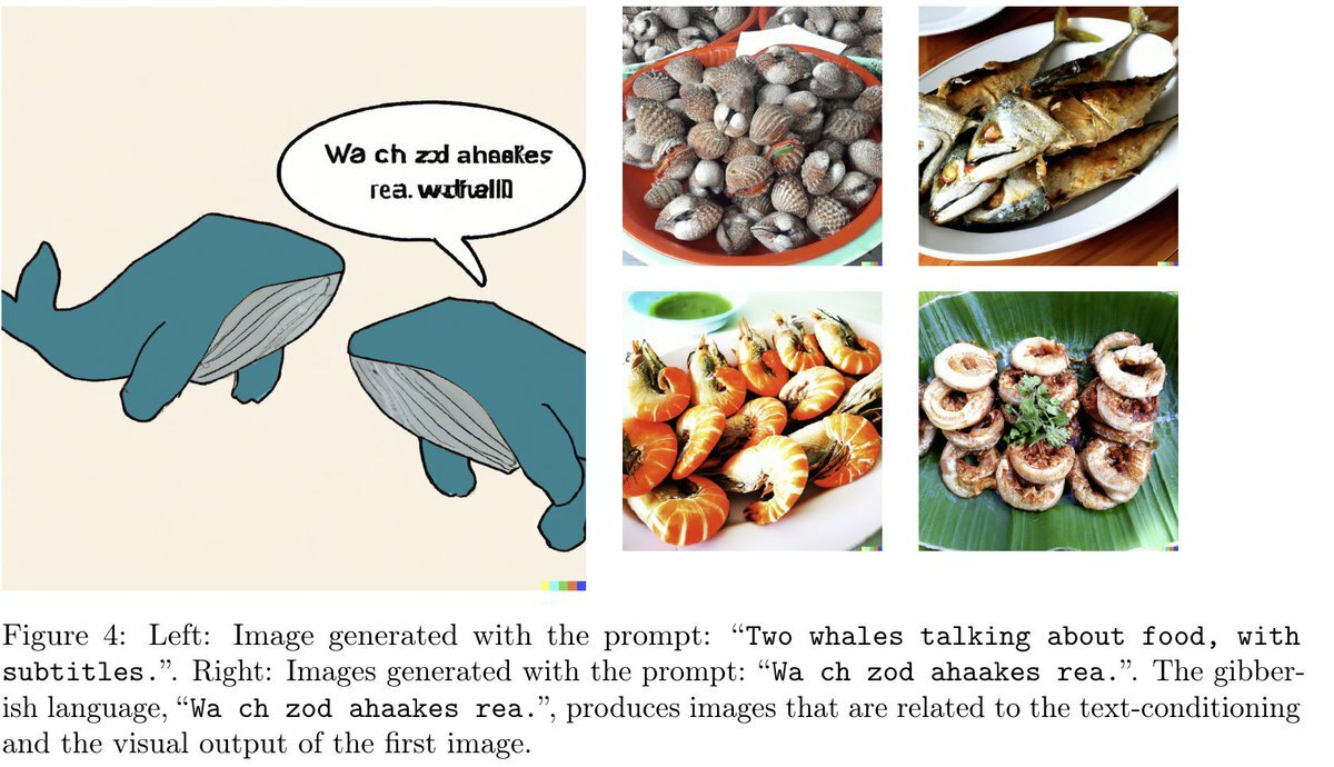 Это не случайность: к примеру, при генерации изображений по запросу «Два кита говорят о еде, с субтитрами» нейросеть генерирует совсем другую фразу — если ввести их как запрос, то создадутся картинки с морепродуктами.