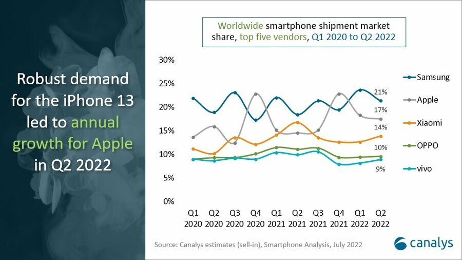 Лидером рынка остается южнокорейская компания Samsung, которая укрепила свои позиции с бюджетными смартфонами из серии Galaxy A. По итогам второго квартала Samsung принадлежит 21% рынка. Apple благодаря высокому спросу на флагманскую серию iPhone 13 удалось занять второе место с 17% рынка. На третьей строчке идет Xiaomi с 14-процентной долей. Также в пятерку лидеров мирового рынка вошли еще два китайских бренда — это OPPO и Vivo, которым принадлежит 10% и 9% рынка соответственно.
