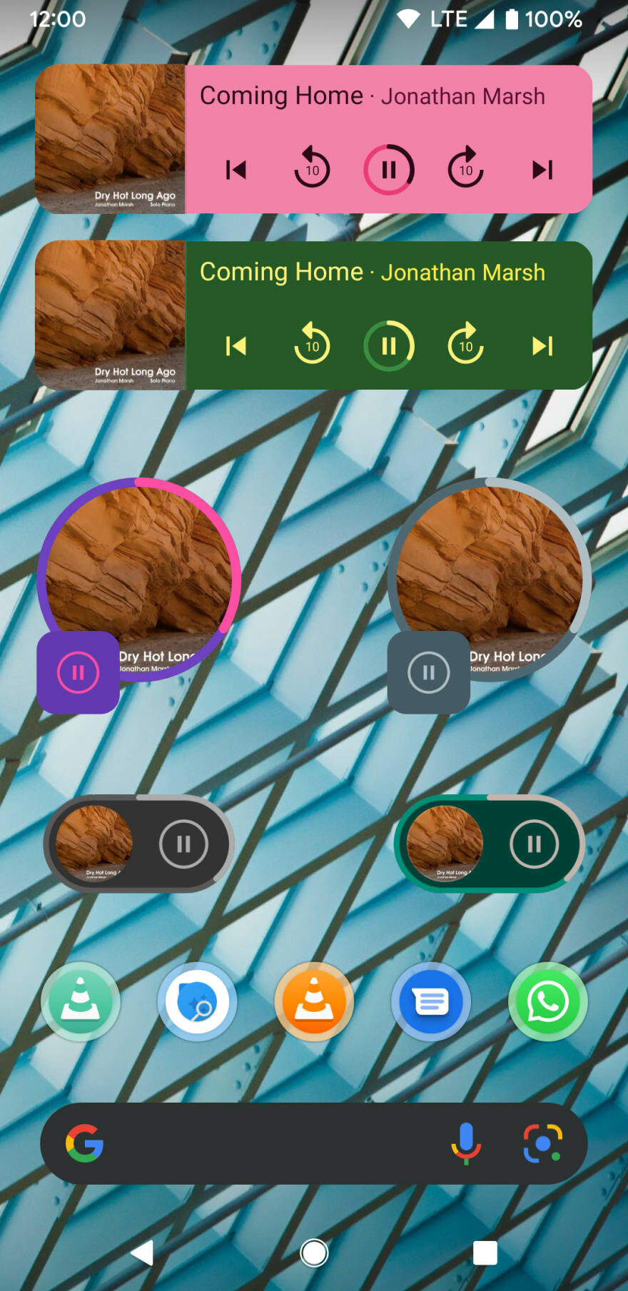 Виджеты плеера доступны в нескольких размерах и формах: крупные получили стандартную форму в виде горизонтально лежащего прямоугольника (прогресс-дорожка в кнопке «Плей/пауза»), средние выполнены в виде круга с прогресс-кольцом, а наименьшие похожи на таблетку с прогресс-ободком. Все они могут детально настраиваться и поддерживают Material You из Android 12/13, то есть адаптируются под цвет обоев: