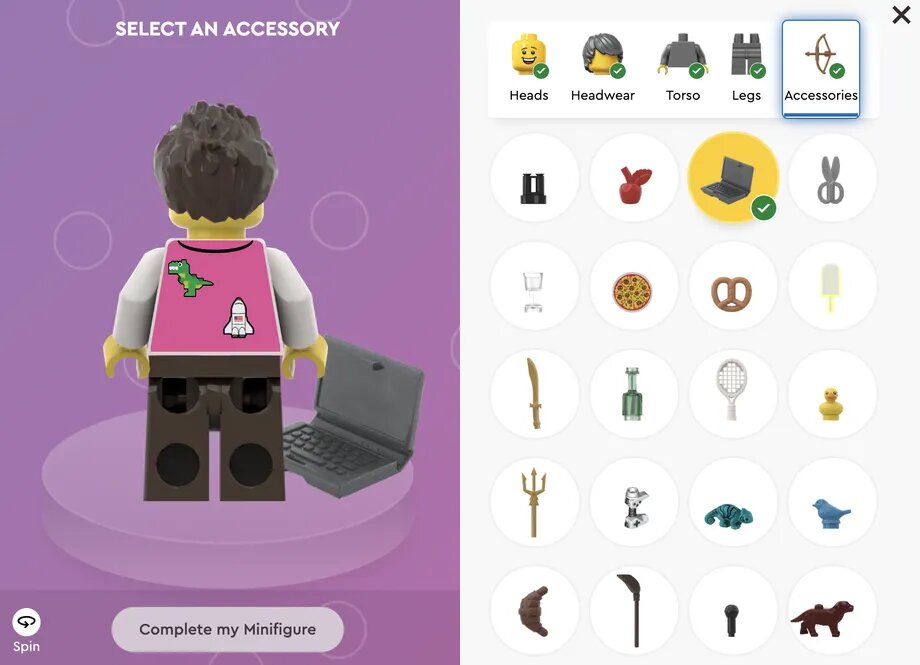 Если верить информации из блога Jay’s Brick, компания LEGO будет в ручном режиме модерировать все проекты пользователей, чтобы энтузиасты с особым чувством юмора не могли создать фигурки с какими-то оскорбительными надписями или рисунками, которые бы могли нанести вред бренду. И, конечно, в онлайн-конструкторе есть ещё и возможность выбирать из целого моря аксессуаров — здесь можно добавить персонажу ноутбук, пиццу или лук. Некоторые аксессуары персонаж может держать в руках, другие же просто поставляются в комплекте и дополняют общую картину.