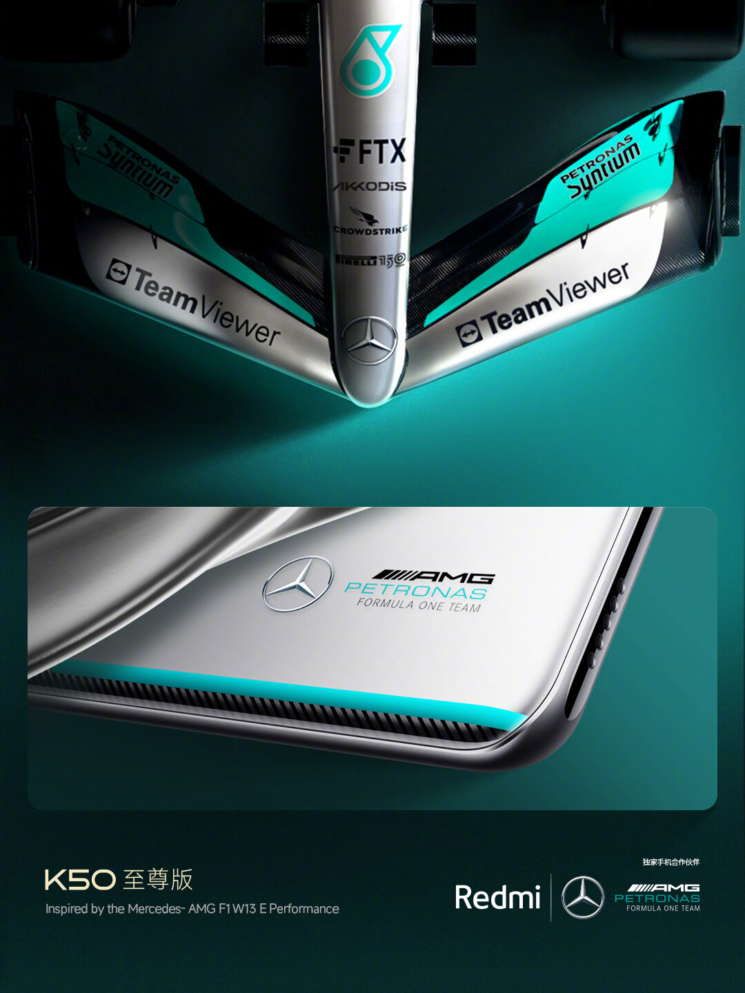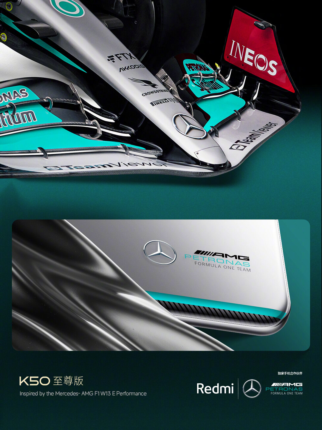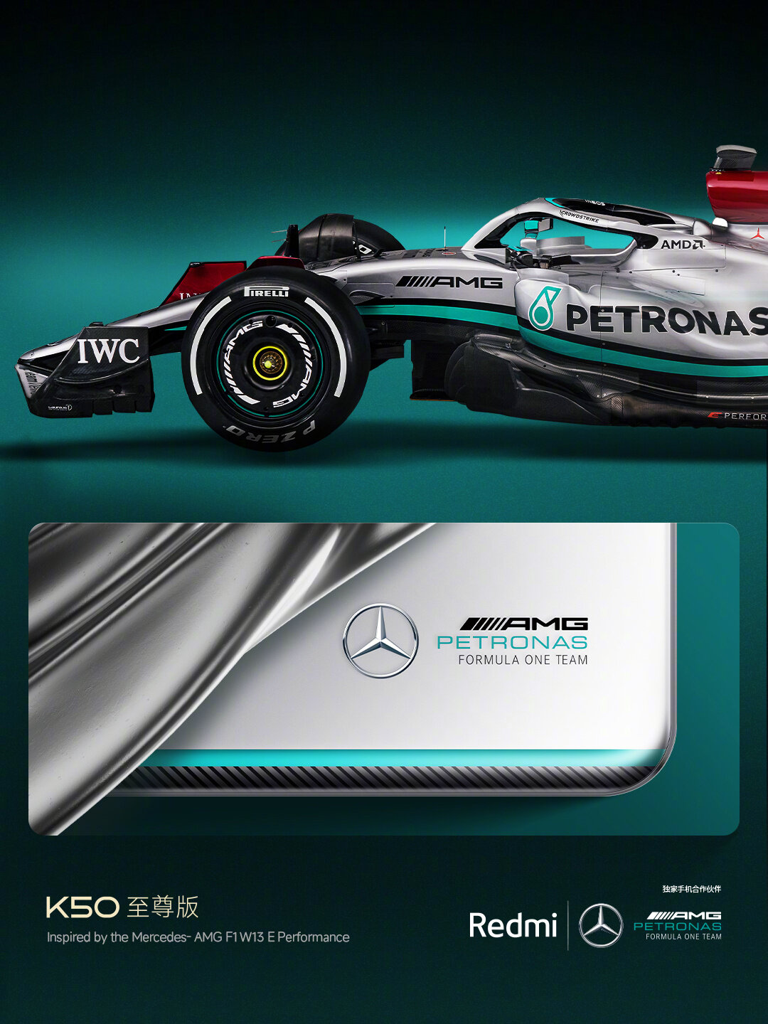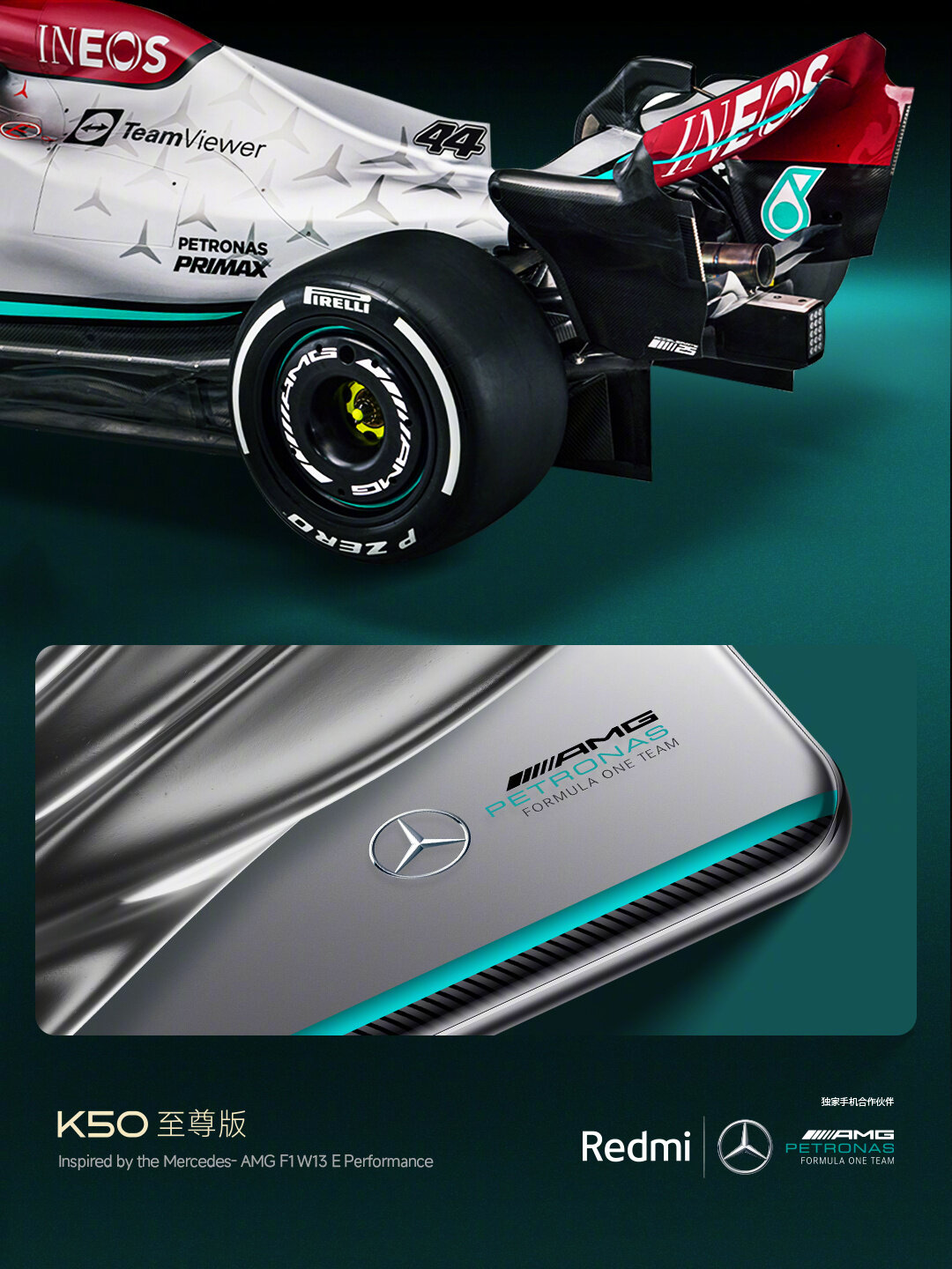 Redmi K50 Extreme Edition в коллаборации с Mercedes-AMG Petronas получил уникальное внешнее оформление с логотипом автомобильного бренда, соответствующими надписями и специальными узнаваемыми полосками.