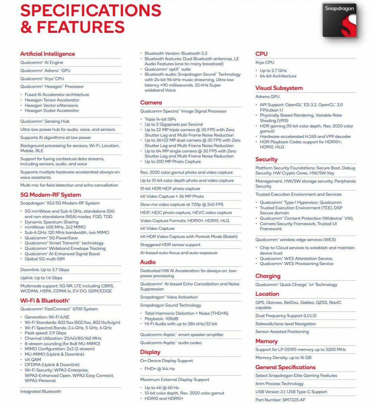 Остальные характеристики чипсета не изменились. Snapdragon 782G поддерживает технологию быстрой зарядки Quick Charge 4+ (до 50% заряда за 15 минут), архитектуру Fused AI Accelerator, содержит тот же процессор обработки изображения Qualcomm Spectra с пропускной возможностью до 2 гигапикселей в секунду и поддержкой разрешения до 200 Мп. Модем — Snapdragon X53 (Sub-6GHz и mmWave), сетевой модуль — FastConnect 6700 с поддержкой Wi-Fi 6. Плюс ко всему есть встроенный Bluetooth 5.2.