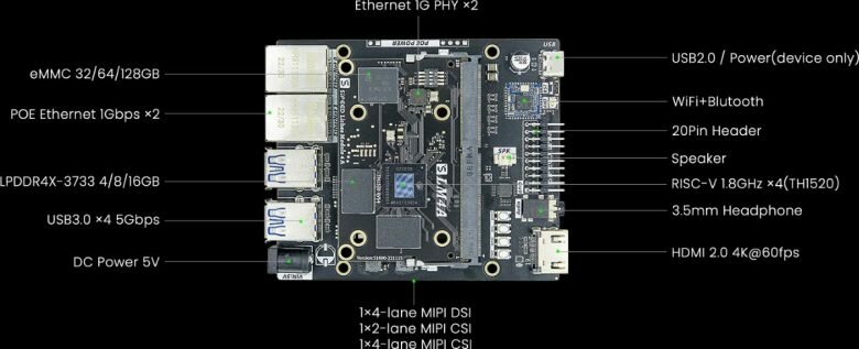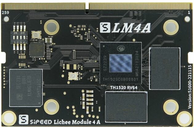 В основе модуля LM4A лежит процессор Alibaba T-Head TH1520. Это 12-нм чип RISC-V с ядрами Xuantie C910, C906 и E902 и производительностью в ИИ-вычислениях до 4 TOPS. Помимо прочего, модуль поддерживает до 16 ГБ памяти LPDDR4x-3733 и до 128 ГБ памяти eMMC. LM4A предназначен для в несущих плат, и первой такой является компьютер Lichee Pi 4A, обеспечивающий множество вариантов ввода-вывода: