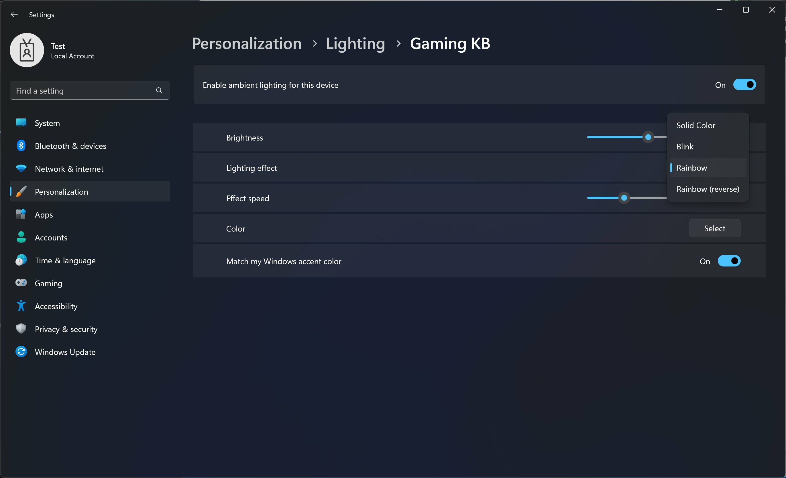 Пользователь Twitter с ником @thebookisclosed заметил в системных настройках новые параметры по работе режима подсветки в последней тестовой сборке Windows 11. Они относятся к гаджетам и позволяют управлять яркостью и цветом, а также различными эффектами освещения. Все эти опции интегрированы в интерфейс операционной системы, есть даже функция, которая синхронизирует подсветку игрового аксессуара с акцентными цветами Windows 11.