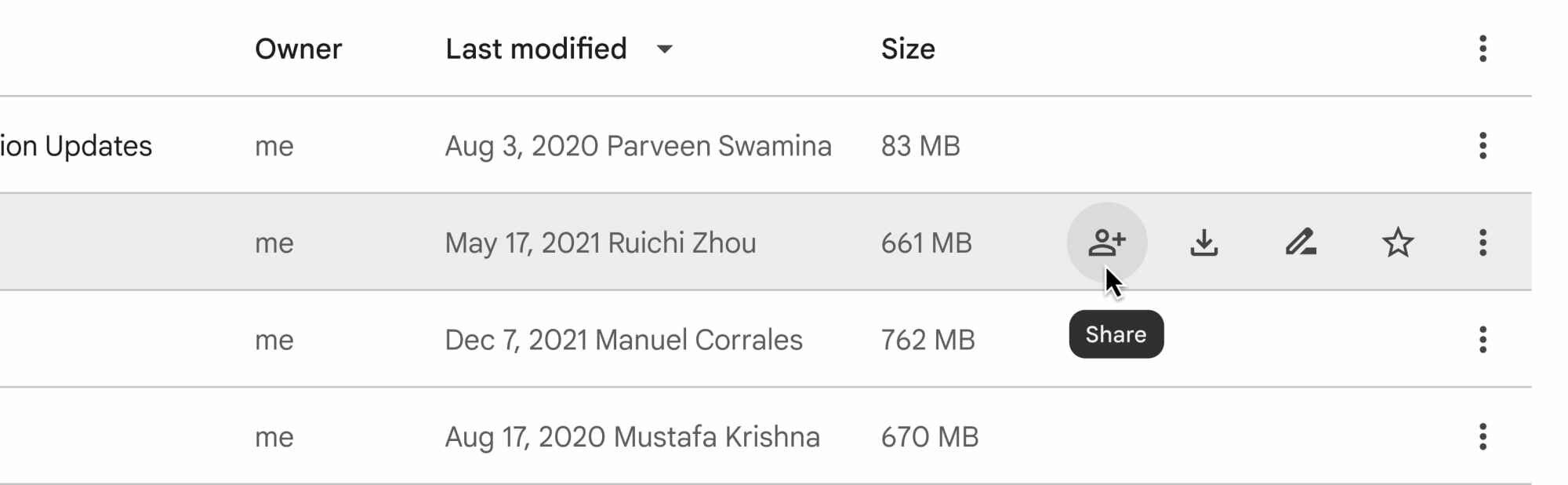 Также теперь при наведении курсора на файл появляются кнопки взаимодействия: «Поделиться», «Скачать», «Переименовать» и «Добавить в избранное».
