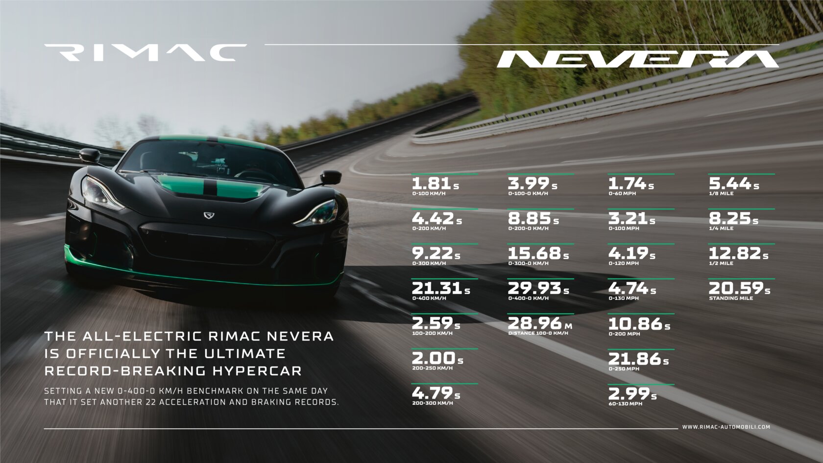 Среди установленных Rimac Nevera рекордов — разгон до «сотни» за 1,82 секунды, разгон от 0 до 200 км/ч за 4,42 секунды, до 300 км/ч — за 9,22 секунды. Тормозной путь от 100 км/ч до полной остановки составил 29,12 метра.
