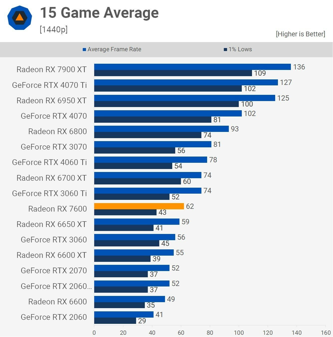 Если же сравнивать видеокарту с конкурентами от NVIDIA, то RTX 3060 Ti оказалась мощнее на 15%, а одна из самых доступных видеокарт прошлого поколения «компании зелёных» RTX 3060 уступила всего 11% производительности. И если в 1080р видеокарта Radeon RX 7600 стабильно демонстрировала 80-90 FPS, то в 2К-разрешении частота кадров буквально на грани — в среднем модель выдаёт 62 FPS, то есть в каких-то играх добиться заветных 60 FPS не выйдет уже в день релиза. Издание Gamers Nexus провело свои тесты и, например, в Cyberpunk 2077 с трассировкой лучей новинка AMD уступила даже RTX 3060 — она проиграла целых 12% в частоте кадров.