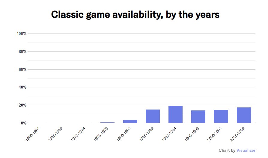 Некоммерческая организация «Фонд истории видеоигр» совместно с компанией Software Preservation Network провела первое в истории исследование коммерческой доступности классических видеоигр на современном рынке — результаты оказались просто ужасными. Специалисты отметили, что 87% классических видеоигр, выпущенных на территории США (крупнейший рынок развлечений в мире), на текущий момент находятся буквально под угрозой исчезновения. Авторы исследования сравнивают текущую ситуацию с культовыми релизами с необходимостью искать подержанную видеокассету и старое оборудование, чтобы иметь возможность посмотреть «Титаник».