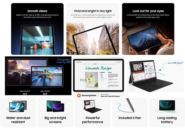Планшеты Galaxy Tab S9 Fe и S9 Fe+ получили технологию Samsung DeX, которая даёт возможность работать на устройстве, как на персональном компьютере, задействовав несколько окон. Новинки совместимы с клавиатурой Book Cover, но её необходимо приобретать отдельно.