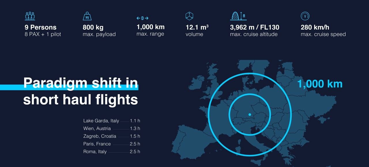 Инженеры компании делают акцент на том, что это не очередной eVOLT (электрический самолёт), а летательный аппарат, который работает на базе водородно-электрической силовой установки. Механизм вырабатывает электрическую энергию из водородного топлива, заряжая аккумуляторные батареи. А шесть винтов, которые отвечают за взлёт, посадку и руление в процессе управления транспортным средством, питаются уже от аккумуляторов на борту самолёта, не взаимодействуя с водородом напрямую. В результате новинка должна при полной загрузке салона и грузового отсека преодолевать расстояние в 1000 километров на полной заправке.