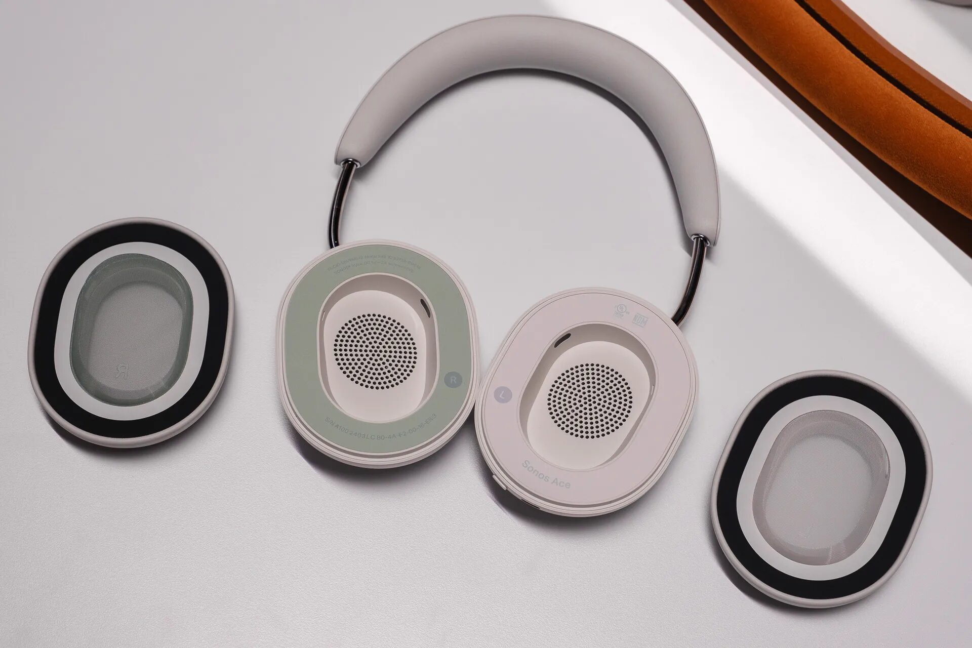 Компания уделила внимание мелочам. Sonos Ace имеют кожаные амбушюры, которые легко магнитятся и также легко снимаются. На внутренней части разная цветовая маркировка, поэтому можно запросто определить, с какой они стороны. На внешней стороне наушников имеется покрытие, устойчивое к отпечаткам пальцев. Оголовье выполнено из пены с эффектом памяти. Наушники поставляются с тканевым футляром для переноски, внутри которого находится чехол для кабеля USB-C (он тоже крепится с помощью магнитов). Все кнопки управления — физические.