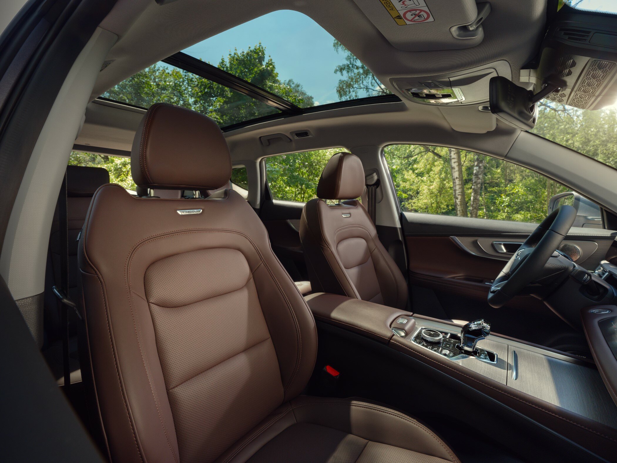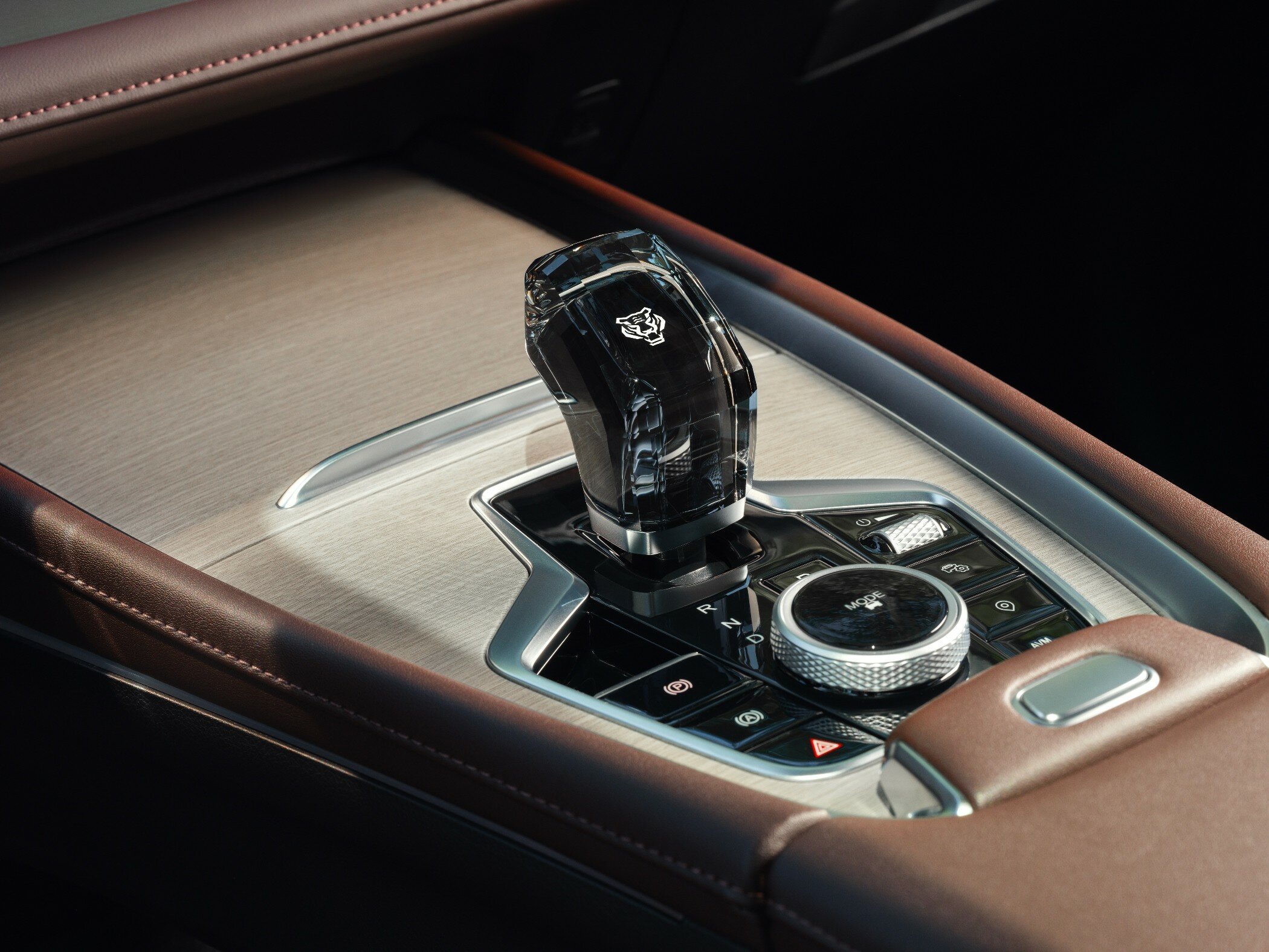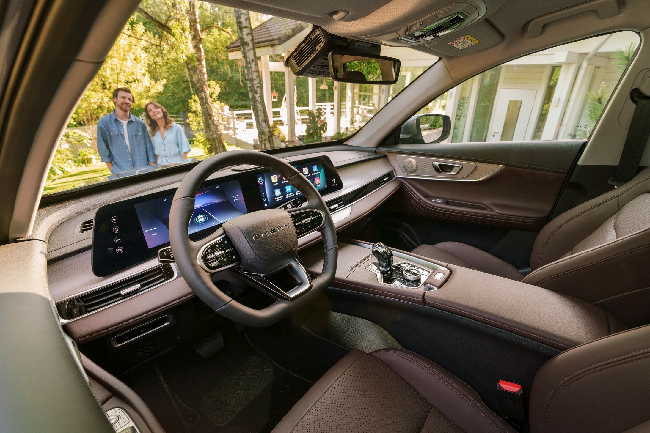 В интерьере тоже много изменений. Tiggo 7 Pro Max порадует владельца роскошным тёмно-коричневым салоном из эко-кожи с серыми матовыми вставками в передней панели и дверных картах. Спереди установлен единый изогнутый экран для мультимедийной системы и панели приборов, состоящий из двух дисплеев по 12 дюймов каждый. Эргономичный селектор коробки передач сделан из прозрачного пластика с изображением тигра. Он очень эргономичный, позволяет легко менять направление движения автомобиля, приложив для этого минимальные усилия.