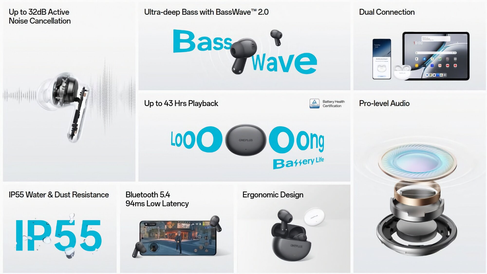 Наушники предлагают улучшенные низкие частоты благодаря алгоритму BassWave Enhancement 2.0 и настраиваемый эквалайзер. Технология активного шумоподавления работает в диапазоне до 32 дБ, а подключение осуществляется на базе Bluetooth 5.4. Стоит также отметить пыле- и влагозащиту IP55, поддержку Google Fast Pair и возможность подключения к двум источникам звука. Автономность OnePlus Nord Buds 3 составляет 12 часов, а с учётом зарядного кейса — 43 часа. В целом, можно уверенно сказать, что новые наушники OnePlus предлагают множество функций топового уровня по очень доступной цене.