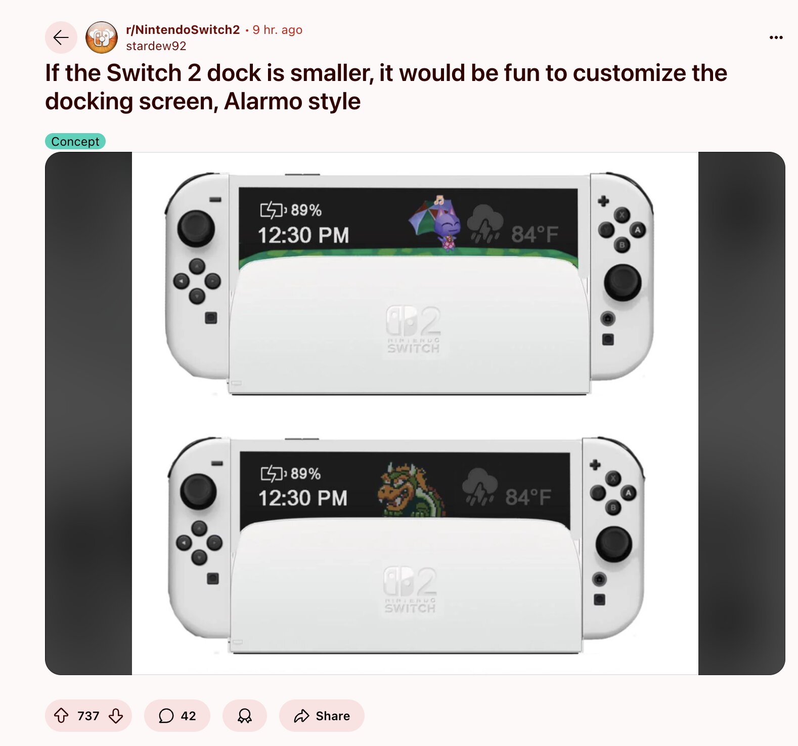Поклонник данной консоли после ряда слухов от различного рода инсайдеров предположил, что Nintendo захочет изменить дизайн док-станции, чтобы в стационарном формате треть экрана консоли можно было использовать для различных бытовых задач.