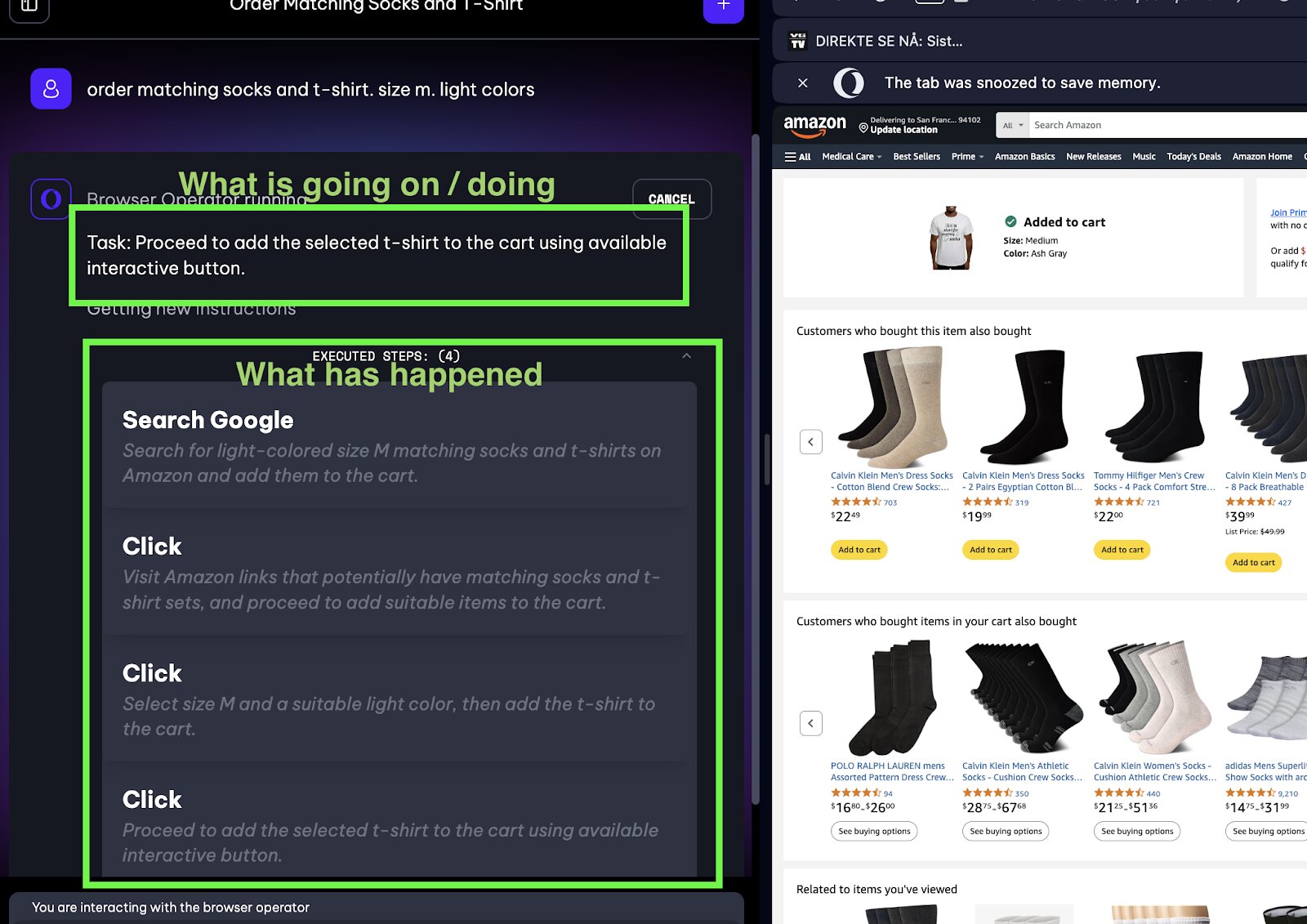 ИИ-агент Opera получает доступ ко всей веб-странице, не требуя её прокрутки, что приводит к быстрым и эффективным результатам. Благодаря этому агент может взаимодействовать с элементами, которые не видны пользователю, например, со всплывающими окнами cookie. В случае, если требуется ввести конфиденциальную информацию, например, данные кредитной карты или пароль, пользователю будет предложено ввести их вручную. Для уточнения инструкции ИИ-агенту может потребоваться дополнительная информация, а выполнение задачи можно отменить в любой момент, нажав кнопку «Отмена».