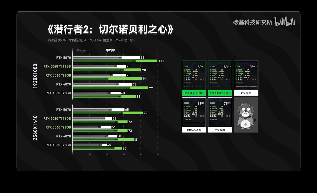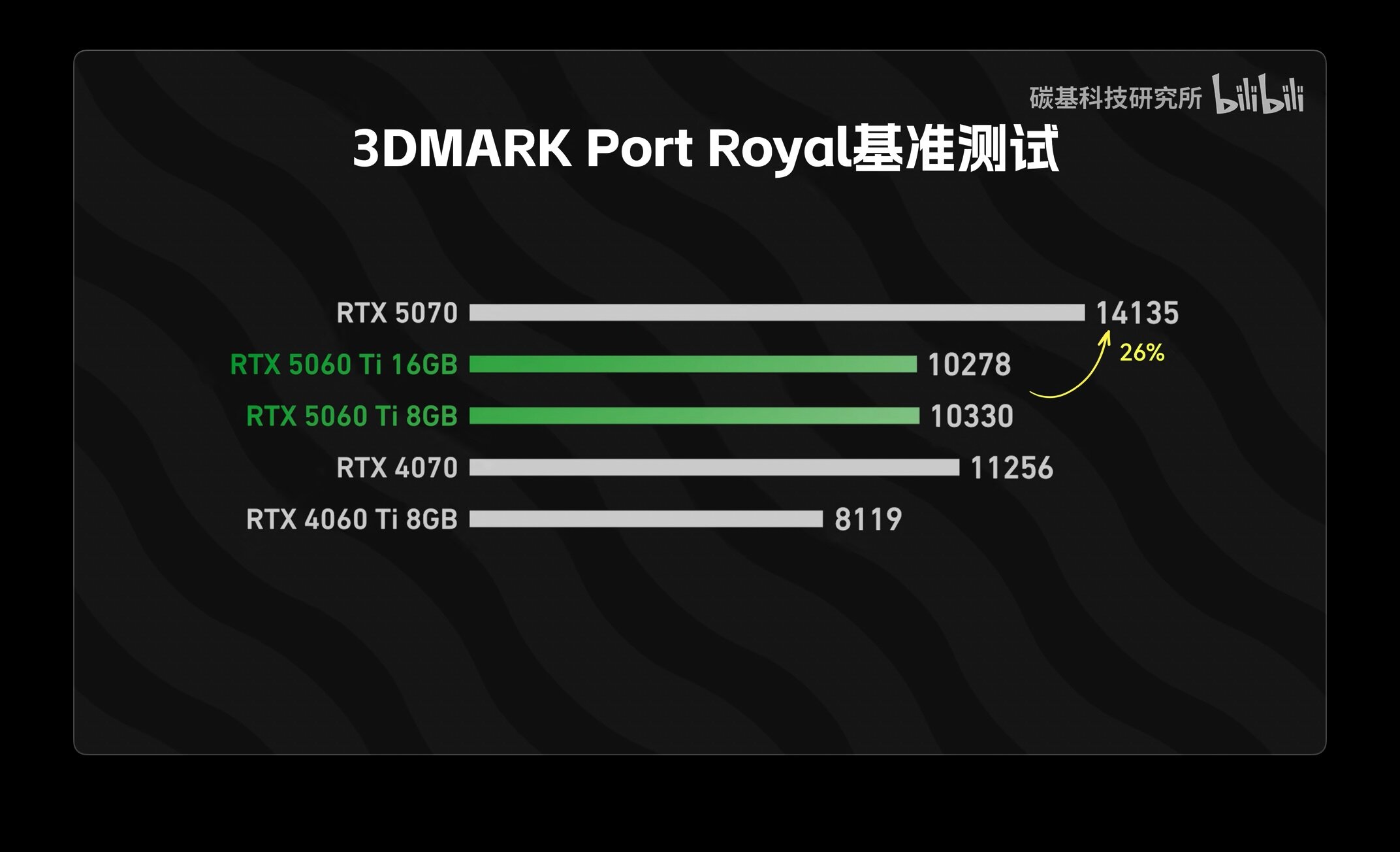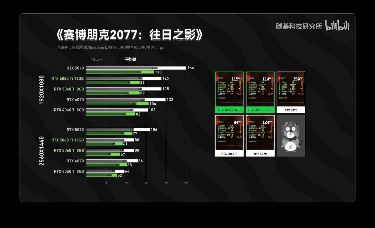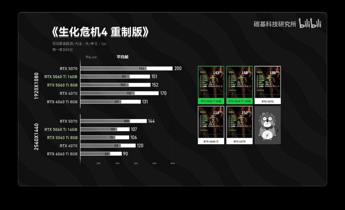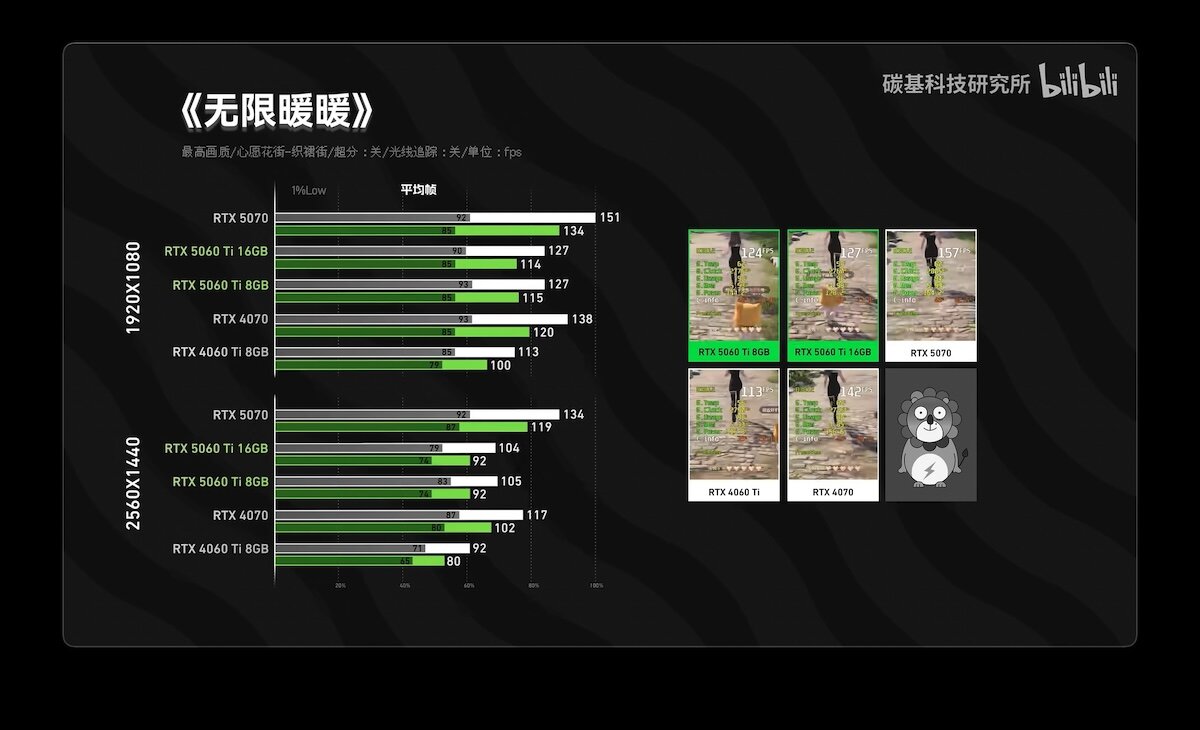 Например, в ролике, опубликованном на видеохостинге Bilibili, автор сначала демонстрирует слайды с результатами тестов в бенчмарках — они выступают наглядным доказательством того, что прирост объёма встроенной видеопамяти существенного влияния на производительность RTX 5060 Ti не оказывает. В 3DMark Fire Strike версия на 8 ГБ набрала почти столько же баллов, сколько и версия на 16 ГБ, а прирост производительности по сравнению с RTX 4060 Ti составляет в среднем 20-30%. Аналогичная ситуация наблюдается в 3DMark Time Spy и других бенчмарках, но самое важное, что карты в большинстве своём показывают идентичную производительность в играх.