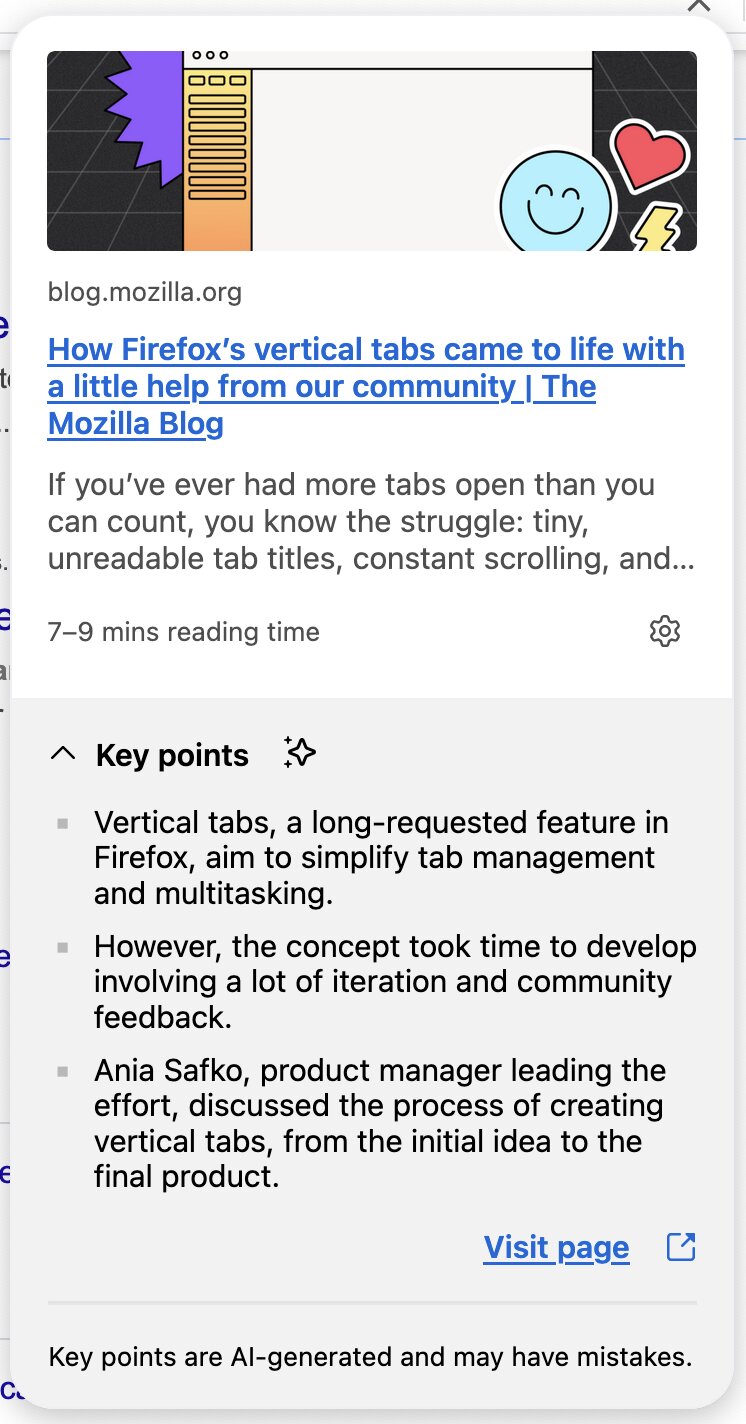 И, пожалуй, важнейшим улучшением данной версии браузера является экспериментальная функция предварительного просмотра ссылок. Её тоже можно активировать через Firefox Labs, получив возможность просматривать страницу и даже получать краткое описание контента на ней (его генерирует искусственный интеллект) без необходимости кликать по гиперссылке. Достаточно просто навести курсор на ссылку и нажать Alt+Shift, после чего появится всплывающее окно.