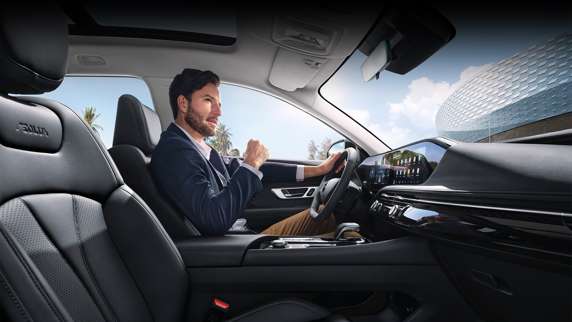 Интерьер новинки продуманный. Спереди установлены широкие сиденья с регулировками и отделкой из текстурированной экокожи Nappa. Для управления климат-контролем предусмотрены физические кнопки, а для шумоподавления и защиты от пыли — дополнительные дверные уплотнители. В автомобиле есть мультимедийная система с большим экраном на русском языке, звуковая система с шестью динамиками и панорамная крыша с электролюком. Багажное отделение одно из самых вместительных в классе — 770 литров.