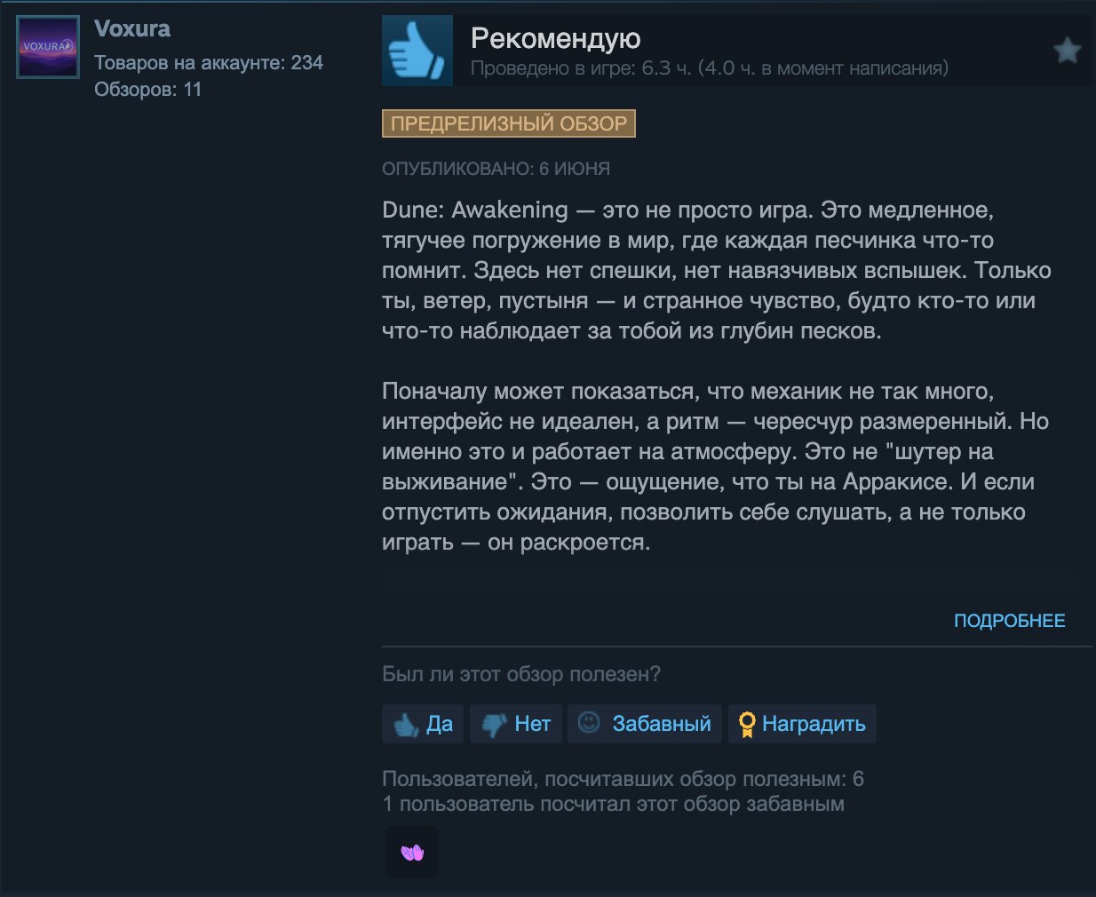 Кроме того, геймерам, которые попали на расширенный доступ, тайтл явно очень понравился — на данный момент в Steam у игры «Очень положительные» отзывы (79% позитивных оценок). При этом в большинстве своём в негативных обзорах Dune: Awakening геймеры не критикуют геймплейные составляющие MMO, сюжет, графику или открытый мир — весь негатив связан с сетевым кодом, периодическими вылетами из игры, различного рода багами и средней оптимизацией клиента. Например, один из игроков написал, что после вылета у него банально удалился персонаж, а у кого-то он исчезал несколько раз подряд. Это, безусловно, проблема для мультиплеерного проекта.