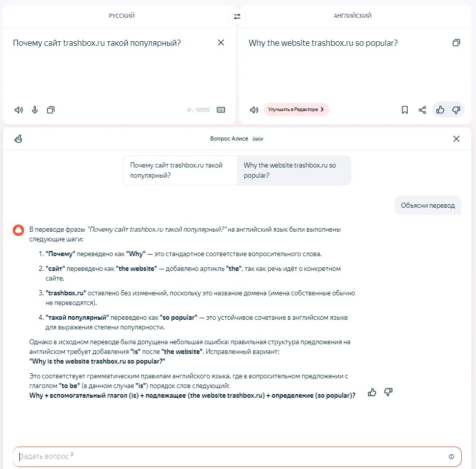Разработчики отмечают, что внедрение Алисы в Яндекс Переводчик открывает новые возможности для самостоятельного изучения английского. Теперь не нужно искать дополнительные приложения или курсы: достаточно открыть Яндекс Переводчик и начать диалог с виртуальным помощником. Сервис подскажет, как правильно использовать слова в контексте, объяснит разницу между похожими выражениями и даже поможет потренировать произношение.