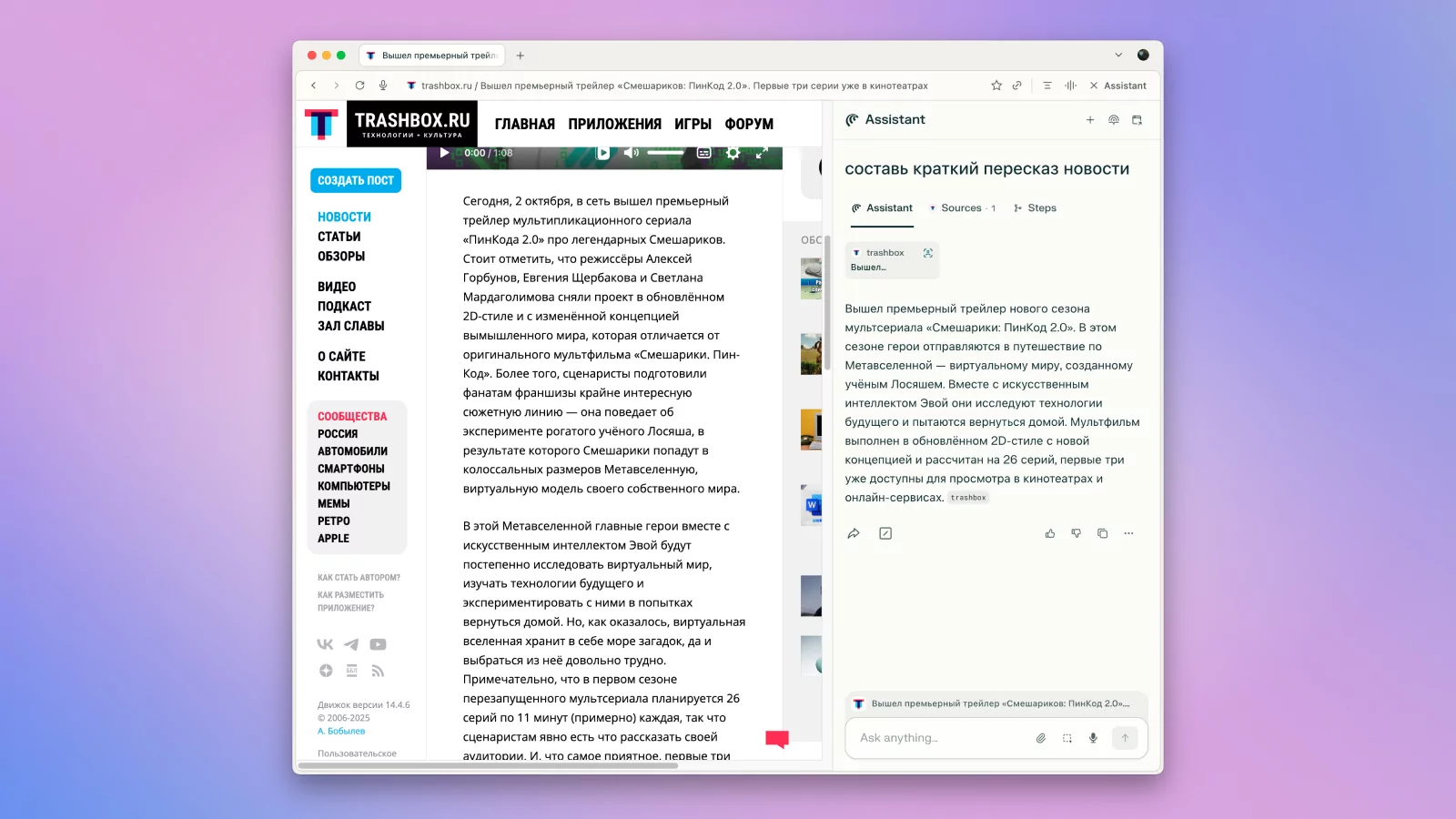 Кроме того, в правом верхнем углу браузера на панели задач имеется отдельная кнопка, позволяющая быстро составить краткий пересказ новости, статьи или любой иной публикации. Это позволяет сэкономить время, так как не придётся каждый раз писать соответствующую команду в чат с ИИ.