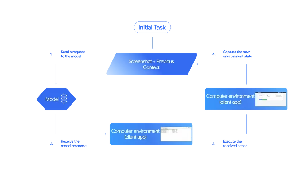 Основные функции Gemini 2.5 Computer Use реализованы через инструмент computer_use в API Gemini, который работает в циклическом режиме. На вход подаются запрос пользователя, снимок экрана среды и история последних действий. При необходимости можно указать, какие функции пользовательского интерфейса исключить или, наоборот, добавить. Принцип работы выглядит следующим образом: начальная задача создаёт контекст — снимок экрана передаётся в модель, которая анализирует данные и возвращает команду для выполнения действия. Это может быть, например, нажатие кнопки, ввод текста или прокрутка страницы. В некоторых случаях модель запрашивает подтверждение от пользователя — например, перед оформлением покупки. После выполнения действия обновлённый снимок экрана и текущий URL снова передаются модели, запускается новый цикл, и процесс повторяется до тех пор, пока задача не будет выполнена.